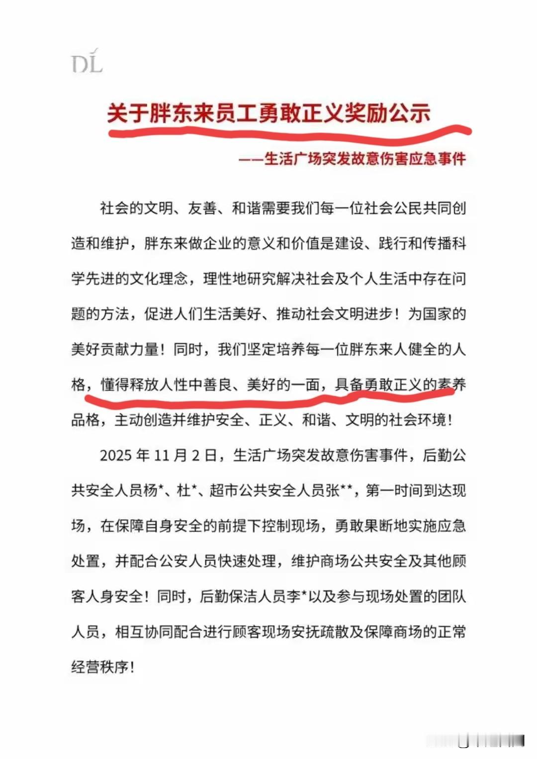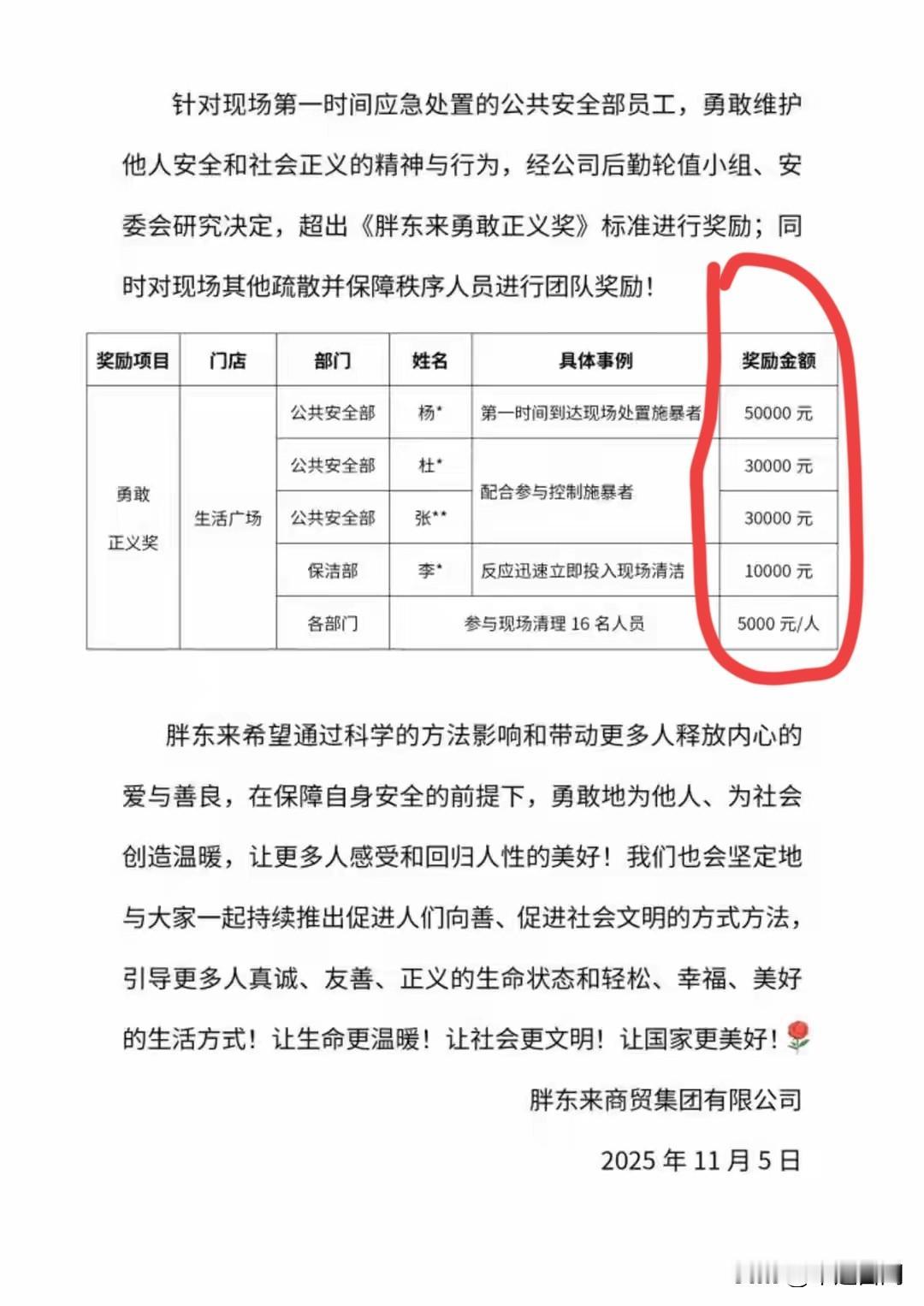 这次我坚决支持胖东来,真金白银奖励见义勇为者,不玩虚的。就这样,引导社会风气向善。 胖东来走到了政府的前面,起到了风向标的作用,实属难得,为中国有这样的企业感到骄傲。 公司对于参与11月2日生活广场突发故意伤害应急事件处置的员工进行奖励,给予20名员工共计20万元奖励,单人最高奖励达5万元。 于东来是个成功的企业家,以前单纯的认为胖东来就是个良心企业,最近看到一系列组合拳才发现是我单纯了,这套高明的营销模式非常高明。先大力宣传立人设,然后打破当前国内用工模式用高薪强管理,最后抓住国人对食品安全的执念做到企业,消费者,员工甚至政府各方都满意!