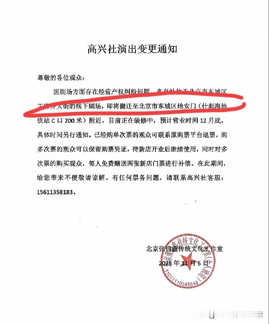 才开了三个月就搬家了! 张伯鑫的高兴社,开张没有几个月,就发出了一张公告,说产权纠纷,要搬家了,新店12月底才开业呢,所以购票的可以退票。 话说开一个相声园子真没有那么容易,看着郭德纲德云社挣钱,很多相声演员也纷纷开启了自己的小剧场小圆子,可是真正挣钱的没有几个。 就连德云社应该也不是每一个都挣钱,如果没有好作品,叫得上名字的好演员,观众又不是傻子。