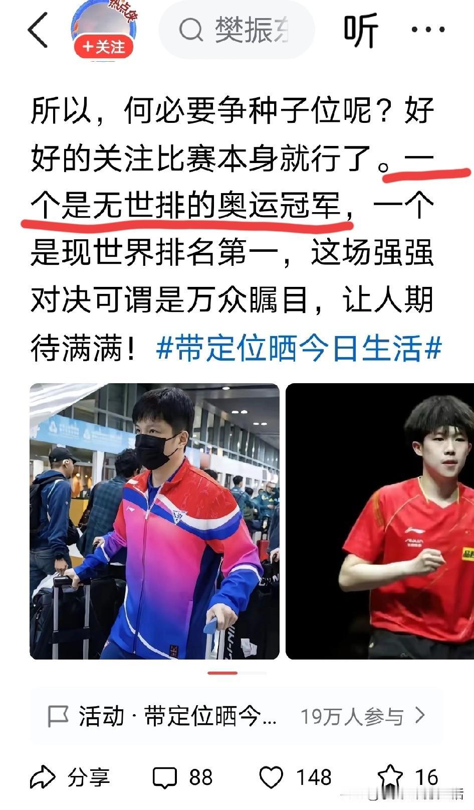 樊振东和王楚钦一个半区,意外也不意外。 我在头条刷到还有人说樊振东无世界排名。 这都按照一年前的世界排名算了。再提这个话题不是搬起石头砸自己的脚吗。 别人不打都扣分。他一年多不打保留原积分。 还说无世界排名,他都世袭世界排名了好吧!