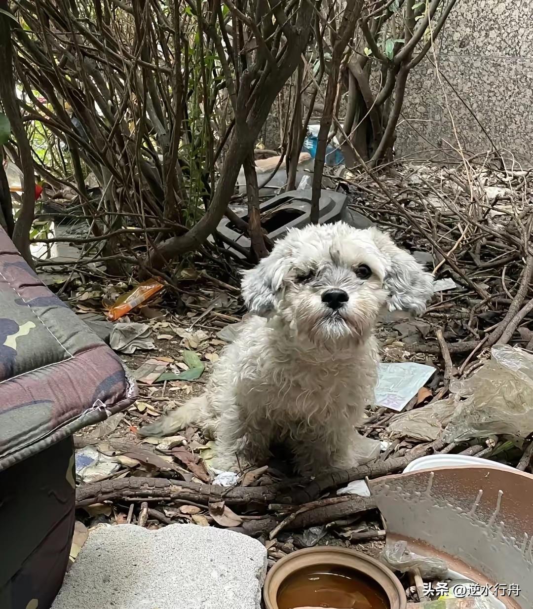 这只小狗因为瞎了一只眼睛被主人嫌弃丢到外面成了流浪狗,只能躲在垃圾箱边上找点吃的