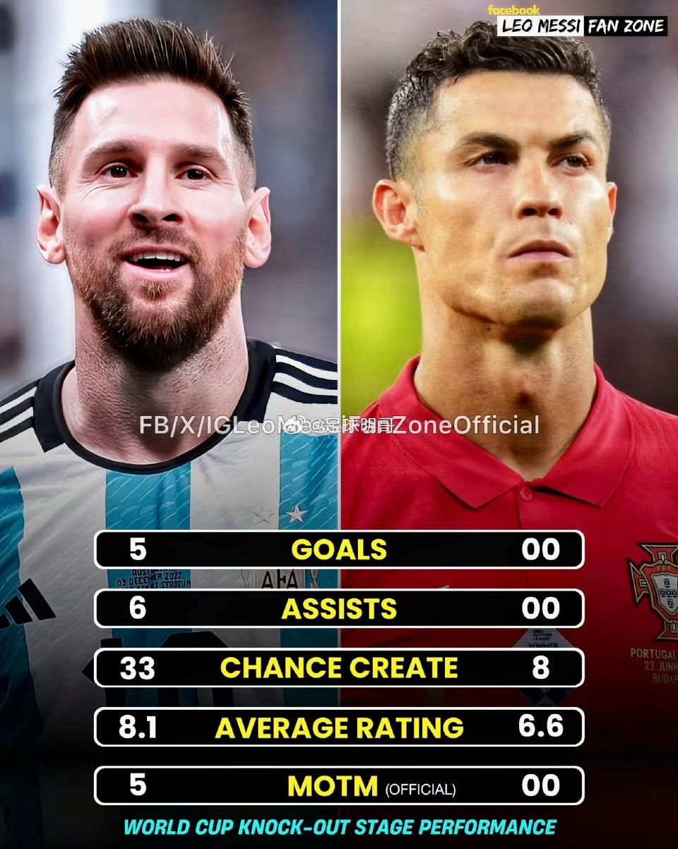 最真实的世界杯淘汰赛数据,梅西>C罗。 梅西总共5球6助攻,有世界杯冠军。 C罗0次进球助攻,所以没世界杯冠军。 这就是两人最大的差距,要是在世界杯多进几个球,带领葡萄牙夺冠,C罗和梅西平级。 可惜世界杯不给力,明年是C罗最后机会,梅西倒是无所谓,不拿冠军,再进几个球刷新进球历史?[可怜][灵光一闪]