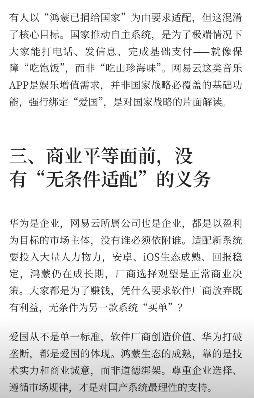 网易云确实没有义务适配鸿蒙系统,相对于运营游戏的高利润适配鸿蒙确实是一件出力不讨好的赔本业务。如果单纯从商业角度来看完全没错,但是一个企业的身上仅仅就剩下了商业利益吗? 商家为了商业利益有自己的选择,同样网友也会有自己的选择。现在可以选择音乐软件太多了,为什么一定要选择你呢?