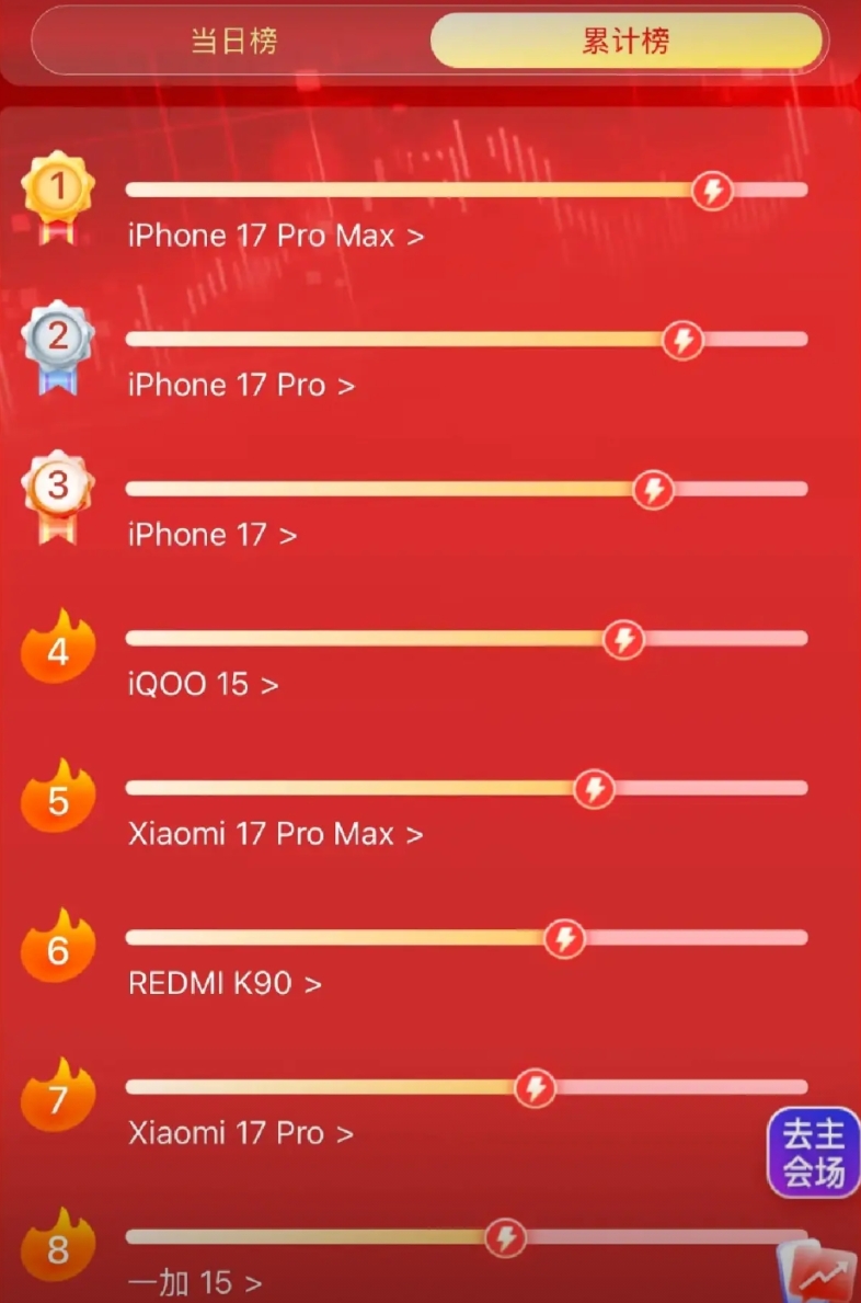 不要羡慕,苹果17真不是吹牛的,直接占了销量累计榜前三,说是遥遥领先一点都不过分。比价意外,iQOO15居然排到第四名,绝对是黑马啊。