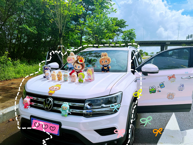 我的爱车内饰独一无二 我的爱车内像闯进童话世界:全皮座椅套着大眼蛙刺绣坐垫,方向盘套是粉白色的玲娜贝儿,中控台上趴着的全是蜡笔小新摆件,出风口挂着卡通香片,脚垫印满星星月亮。后视镜坠着毛绒球挂饰,连安全带卡扣都套着小熊套。阳光洒进来,每个角落都软乎乎的,开车都像在和小可爱们约会~