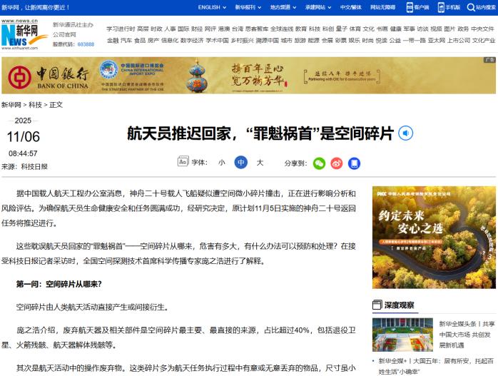 估计现在人们最担心的,就是神舟二十号的航天员,不是因为他们没有成功交接,也不是因为他们没有圆满完成任务,而是因为他们在返回的过程中出现了意外情况。 11月5号,中国载人航天工程办公室直接发了消息:神舟二十号疑似被太空里的微小碎片撞了,原计划当天的返回任务只能推迟。全国等着看航天员回家的人,心里瞬间揪紧,搁谁都得替这几位航天员捏把汗。 这种紧张真不是瞎担心,太空里的“隐形杀手”可比咱们想的密集多了。 欧洲航天局2025年的报告早拉过警报:近地轨道上,能一直追踪到的、直径超10厘米的大碎片就有足足4.4万个,1厘米到10厘米的“中等威胁”超过100万个,而毫米级的微小碎片更是多到1.4亿个。 这些碎片加起来总质量超14500吨,堆在一起快赶上10艘航母的重量了,就这么飘在天上,想想都觉得惊险。 这些碎片的来源可太杂了。40%以上是退役卫星、火箭残骸这类没用的航天器,剩下的有航天任务中掉的螺栓、工具,有航天器老化脱落的涂层碎片,更要命的是碰撞产生的次生碎片。 2009年美国铱星33和俄罗斯宇宙2251卫星撞了一下,当场炸出2000多块10厘米以上的碎片,到现在还在轨道上瞎转悠。 它们的速度快得离谱,普遍能到每秒7到10公里,比子弹快十几倍。哪怕是1厘米粗的碎片,撞上来的力道都能穿透航天器外壳,毫米级的也能把关键部件划坏。 1996年法国的Cerise卫星就吃了这亏,被火箭爆炸的碎片撞坏了重力梯度杆,最后姿态失控,彻底报废了;美国航天飞机亚特兰蒂斯号在轨道上待了11个月,太阳能帆板上被砸出2000多个坑,连舷窗都有撞击孔,万幸没造成人员伤亡。 神舟二十号遇上的情况也透着凶险。地面测控系统回头查数据,发现撞上来的碎片大概1.2厘米粗,是2019年俄罗斯一枚报废火箭的末级残骸。 别小瞧这手指头粗的碎片,它在400公里高的轨道上撞过来,冲击力相当于300公斤的重物从10层楼往下砸,飞船服务舱的外部涂层直接被撞破,推进系统的管路都被划出了划痕。 更要紧的是返回舱的防热大底,这东西再入大气层时得扛住2000℃的高温,哪怕只有一点点小裂纹,都可能在高速摩擦中出大问题。这也是任务指挥部果断推迟返回的核心原因——航天员的安全,半点儿侥幸都不能有。 好在中国航天早有准备,神舟飞船的防护体系堪称“太空铠甲”。服务舱用的是三层防护的三明治结构,每平米重量不到2公斤,却能顶住1厘米粗、速度7公里/秒的碎片撞击,比传统防护层的性能提升了两倍。 地面的天地协同监测网络也真不是盖的,靠光学望远镜、雷达阵列和北斗系统一起发力,能提前72小时预警可能的碰撞风险。 这次就是推进舱外侧的粒子探测器先捕捉到异常信号,才给应急处置抢出了宝贵时间。 险情发生后,天和核心舱那10.2米长的机械臂立刻伸了出来,带着高清相机给飞船做了360度全方位“体检”,地面团队熬夜算了20多种可能出现的风险场景,连神舟二十一号都加满了燃料,处于8.5天内就能应急发射的待命状态。 这种谨慎真不是小题大做,而是太空探索必须有的态度。国际空间站每年都得做3次以上的轨道机动来躲碎片,耗掉的燃料可不是个小数目;中国空间站靠“主动监测+被动防护”的组合拳,把安全系数拉满,航天员已经在舱外装了70%的防护装置。 神舟十七号乘组还实打实演练过太阳翼被撞后的在轨维修,这套“预警-防护-应急”体系早就经受过考验。 有意思的是,中国还在从根上解决太空垃圾问题,实践二十五号卫星靠在轨加油技术,让原本失效的卫星多用了八年,直接减少了数千吨可能产生的碎片,也算是给太空“减负”的实在办法。 随着太空探索越来越频繁,轨道上的碎片密度还在慢慢上升。1977年科学家凯瑟勒预言的“碰撞级联效应”可不是吓唬人的——一旦碎片多到一定程度,撞击产生的新碎片会引发连锁反应,最后可能形成一层“碎片云”,把人类进入太空的通道都堵上。 神舟二十号这次的“太空急刹车”,也算给全球航天界再提了个醒。不过从这次的处置过程能看出来,从发现撞击到完成风险评估,再到制定新的返回方案,整个流程又快又稳,也让大家看到了中国航天应对突发险情的硬实力。毕竟,能把航天员平平安安送上去,更得有本事把他们稳稳当当接回家。