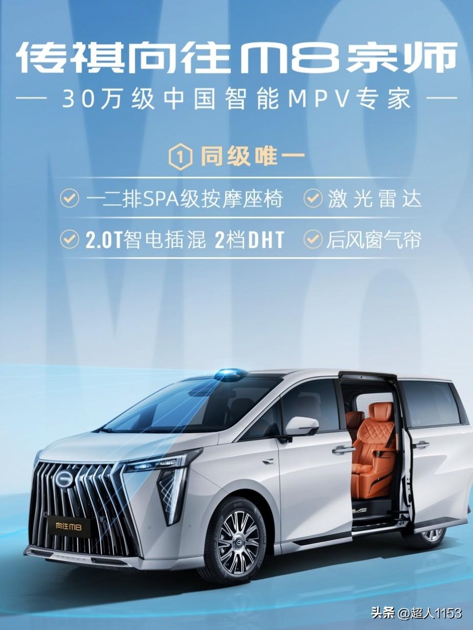 加油吧!写汽车征文每天的阅读量很低,全凭和友互相鼓励互相帮助。一起为向往M8宗师加油打caLL! 传祺向往M8宗师,它是25万级的豪华MPV的天花板,是中国MPV的安全专家。由中国著名篮球运动员联赛八冠王的周鹏大力推荐,冠军周鹏携手传祺向往M8宗师,给我们诠释了“向往最好的生活”。 传祺向往M8宗师,于10月16日在新能源车展上隆重上市。补贴后仅以24.99万元起售。传祺MPV家族销量已突破80万辆,M8更以45万辆成绩成为中国豪华MPV销售冠军,它的质量与保值率常年稳居行业第一。 向往M8宗师第一排配备同级唯一的16点三层气带按摩座椅,570mm的超长坐垫,让两米高个子也能舒展双腿。第二排166度可调零重力的座椅,搭配雅马哈头枕音响,搭载算力254TOPS的英伟达orinX芯片,和27个高清传感器。 向往M8宗师配备了126线激光雷达,探测的距离超过了200米。动力系统也采用了同级唯一2.0T+2DHT插混,综合扭矩645N.m满电续航1400公里,馈电油耗仅6.05升。首创了360度环抱式气囊的矩阵,81.7%高强度钢车身配置,通过了重型货车连环碰撞测试,弹匣电池保持480亿公里零自燃的优秀记录。