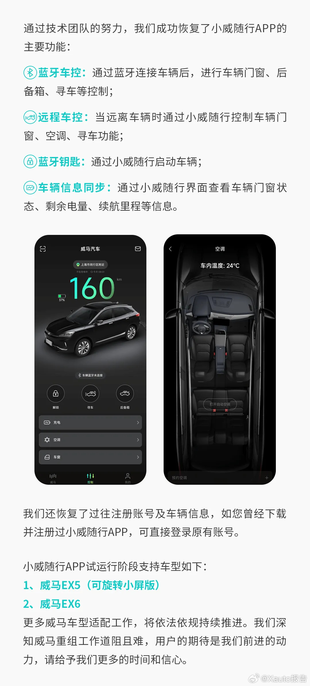 威马汽车近日预告“好事将近”,并宣布小威随行APP于11月5日重新登陆iOS与Android。该APP已恢复蓝牙/远程车控、蓝牙钥匙、车辆状态同步等功能,并保留原账号与车辆数据。试运行阶段支持威马EX5可旋转小屏版及EX6两款车型。