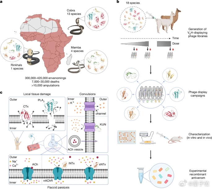 研究团队用18种非洲毒蛇(包括曼巴、眼镜蛇和唾蛇)的毒液对动物进行免疫,并筛选出8种高效VHH(即纳米抗体);