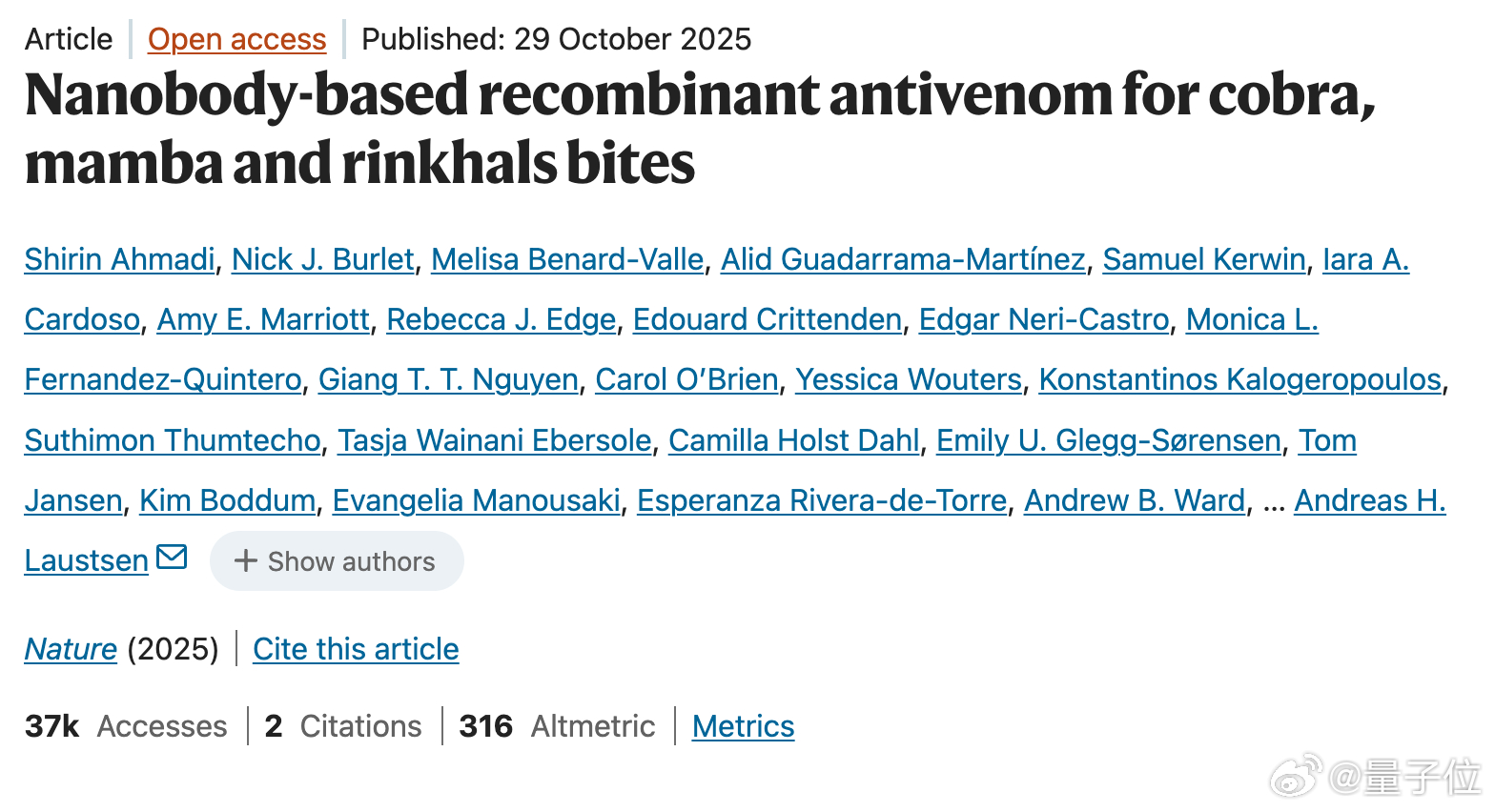 如今,科学家可能找到了“广谱蛇毒解药”,论文已发表在《Nature》。