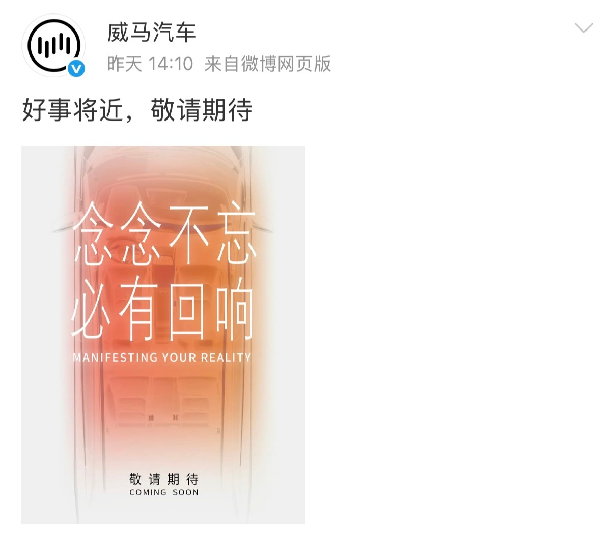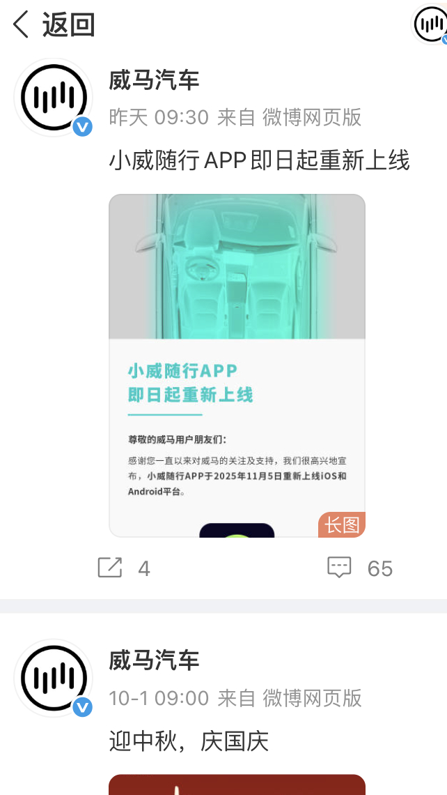 威马 求生欲很强,前两天发的“念念不忘、必有回响”微博,现在却又被隐藏掉了。