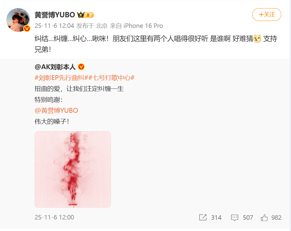 刘彰黄誉博纠缠不清AK刘彰与黄誉博全新合作曲《纠》今日惊喜登场!当的慵懒旋律遇见的独特声线,会碰撞出怎样的火花?一场关于爱与恨、纠缠与挣脱的情感风暴,等你来听。刘彰EP先行曲纠
