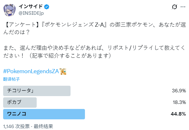 日媒近日发布了投票活动,调查《宝可梦传说:Z-A》御三家人气。共有1,146名玩家参与投票,结果显示,小锯鳄以44.8%支持率位列第一,约500人选择它作为首个伙伴。菊草叶以36.9%的支持率排名第二,而暖暖猪排名第三,支持率为18.3%。 ​​​