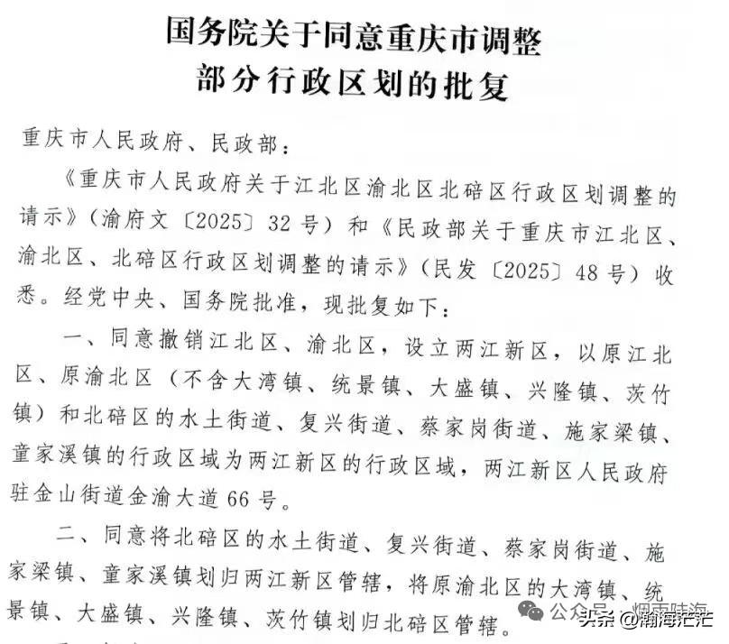 重庆市撤销渝北区,江北区转正两江新区。 重庆市撤销渝北区,江北区转正两江新区,并且调整了北碚区和两江新区的管辖范围。看来,减少区县数量有利于功能区转正。