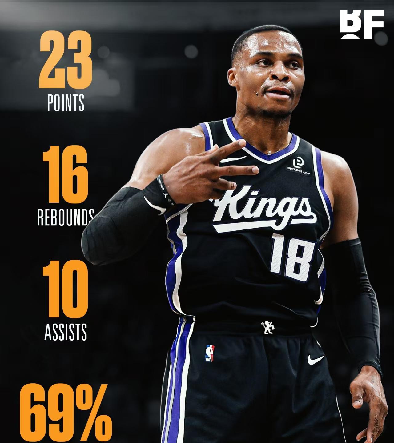 威少:我等这一刻很久了! 勇士对阵国王,两队都有核心球员缺阵,勇士缺了库里、追梦、巴特勒,国王队则缺了小萨博尼斯、拉文,还有个受伤的穆雷。 相当于,两队都是2个首发带着二阵。要说上半场,勇士也打得顺风顺水,一度领先国王13分。 作为“强队鉴定器”的希尔德上半场一度3投3中,差不多就坚定国王队为弱队了。 没想到,第三节风云突变,原本的“勇三疯”没出现,“勇三疯”变成了“勇三崩”,国王队单节赢了勇士12分反超比分。 末节,国王队稳住了局面,最终121-116战胜勇士。 这场比赛,国王队表现最耀眼的当属拿着底薪的威少。 威少本场比赛继续打大前锋,上场35分钟,上场35分钟,13投9中,三分4中3,罚球2中2,高效得到23分16篮板10助攻的三双。 最后时刻,防守造成波杰的失误,杀死比赛。 这也是威少加盟国王队以来的首次三双,这场比赛的威少,进攻高效,三分还准,拼抢凶猛,前场篮板全队最多,失误也不多,可以说是完美状态的威少。 加盟国王以来,威少表现并不差,目前8场比赛,场均15分7.1篮板5.6助攻1.4抢断,投篮命中率46%,三分命中率高达43%。 单从这表现来看,国王这笔签约是相当的值了。 今年夏天,威少成为自由球员,迟迟没能得到合同,直到常规赛快开打了才底薪签约国王。 这样的威少,值得更多的尊重。