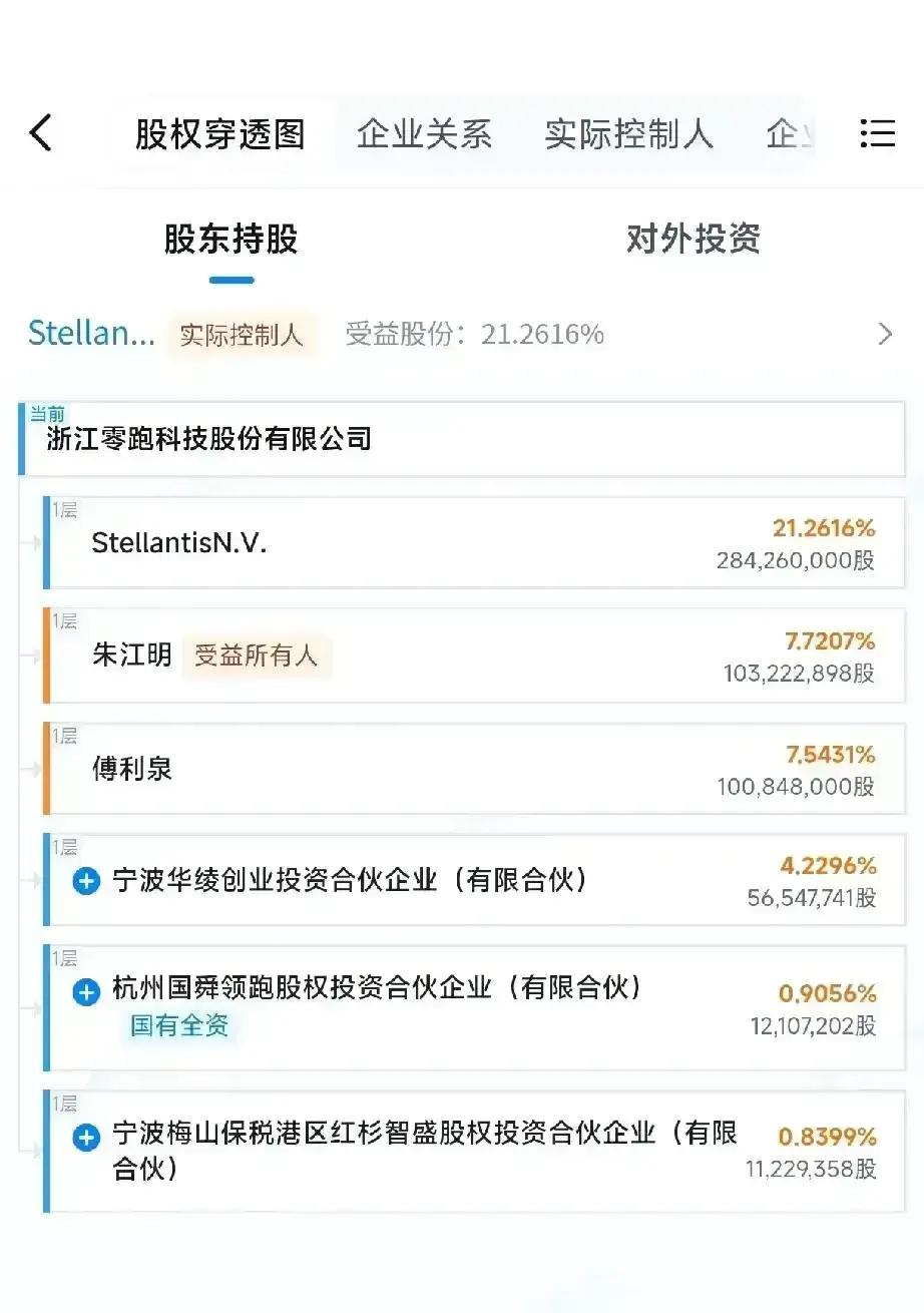 法国汽车制造商标致雪铁龙的母公司斯泰兰蒂斯集团居然是浙江零跑第一大股东,这是很多人不知道的事(如图一天眼查截图所示,斯泰兰蒂斯持股占比第一)。 10月零跑国内销量超越7万辆,成为新势力第一。如此说来,斯泰兰蒂斯有15个品牌,不减反增? 根据零跑汽车2025年的股权结构,斯泰兰蒂斯集团持有21.26%的股份,为第一大股东。但斯泰兰蒂斯方面明确表示,其目的在于战略投资与合作,并不寻求对零跑的控制权,仅参与共同决策。 双方在2023年10月达成战略合作,斯泰兰蒂斯投资约15亿欧元入股。更重要的是,它们按49:51的比例成立了合资公司“零跑国际”,由斯泰兰蒂斯主导零跑汽车在海外市场的运营,而零跑则提供技术和产品支持。 目前,零跑国际已在全球建立了超过1500家门店。这是一场优势互补的合作。斯泰兰蒂斯希望借助零跑的技术和产品打开中国市场并加速电动化转型;零跑则可以利用斯泰兰蒂斯遍布全球的销售网络,快速拓展海外业务。 零跑汽车在2025年10月交付量达到70,289台,首次突破7万辆大关,连续8个月位居中国造车新势力销量榜首。 销量的快速增长也带动了财务健康度的提升,零跑在2025年上半年首次实现了半年度净利润转正。 当前中国东风汽车公司在斯泰兰蒂斯的持股比例为1.58%。
