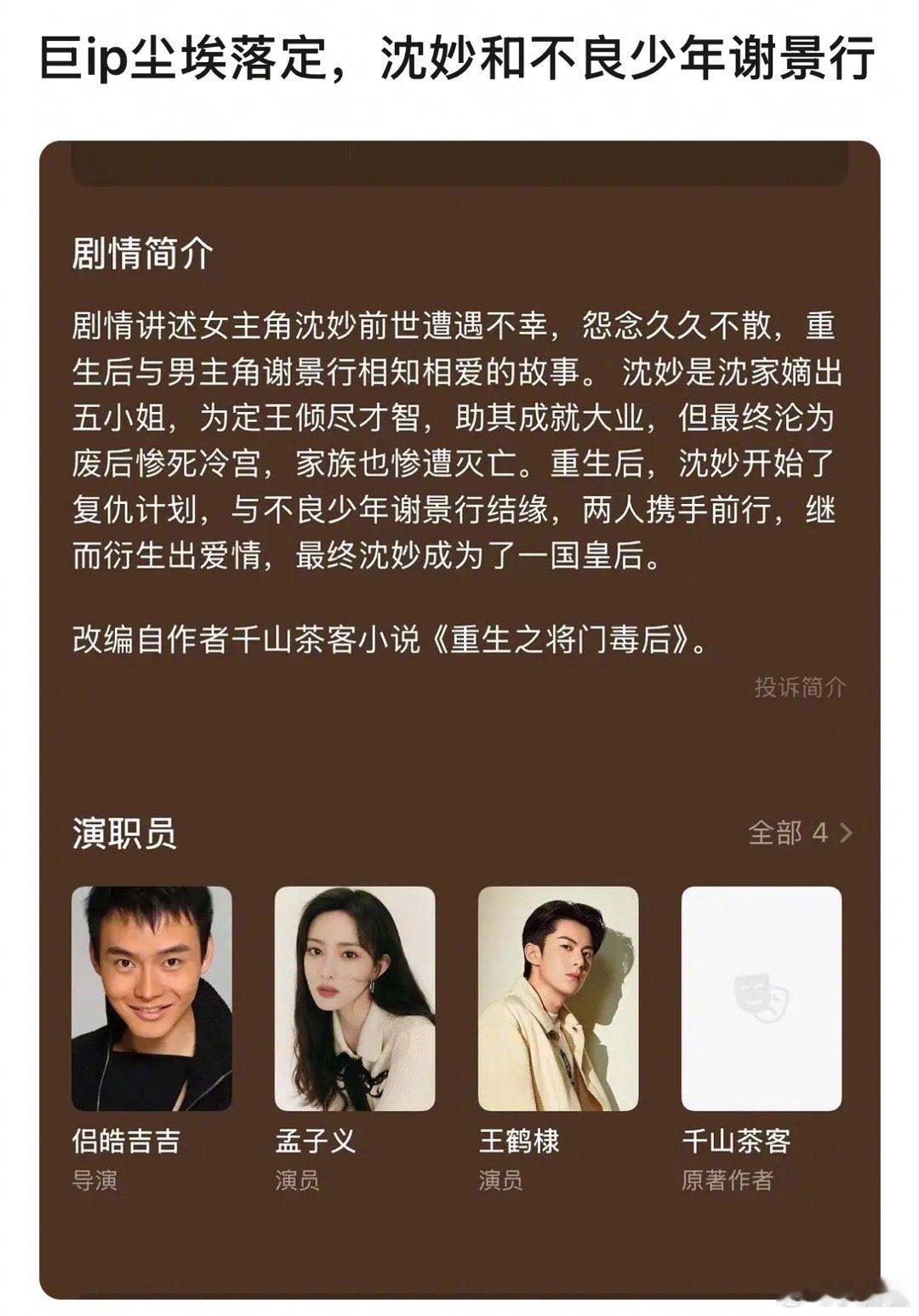 将门毒后尘埃落定王鹤棣孟子义的搭配怎么样,期待吗~