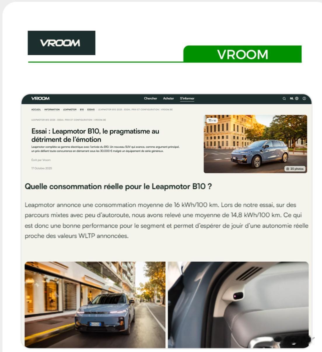 远销欧洲的零跑B10,海外口碑如何? 零跑B10法国全球媒体试驾,就是最好的答案。本次试驾有30国约200多家媒体参与,更包含11家全球顶级媒体。 据海外媒体试驾反馈来看,各大头部媒体都对零跑B10予以了好评。如B10的科技配置、辅助驾驶表现就让ta们眼前一亮。包括B10沉稳扎实的动态反馈,和可圈可点的动力表现,也给海外媒体留下了深刻印象。毕竟,在出口欧洲前,零跑B10就在全球200城完成了百万公路路测,通过了全球53国标准严苛验证,环保健康也获得欧盟认证,全球化品质毋庸置疑。 正因产品表现足够好,零跑B10才得以收获如此可观的全球口碑。尤其对国人消费者来说,大家更是买到就赚到。因为欧洲销售的B10起售价为2.99万欧,换算为人民币已是20大几万,但国内在售的B10起售价则为9.98万人民币。 此外,国人消费者买到的B10配置还更高,如8295P+8650双旗舰芯片,仅需11万级预算就能得到;而且,国内销售的零跑B10还带激光雷达硬件,具备端到端辅助驾驶能力。直白来讲,国人消费者不仅能用更低价格购入,得到的还是“满阶版”零跑B10,品价比如何可见一斑。现在下定,即享四项终身免费质保+至高价值19000元限时礼遇,更划算,大家可以到店里详细了解。