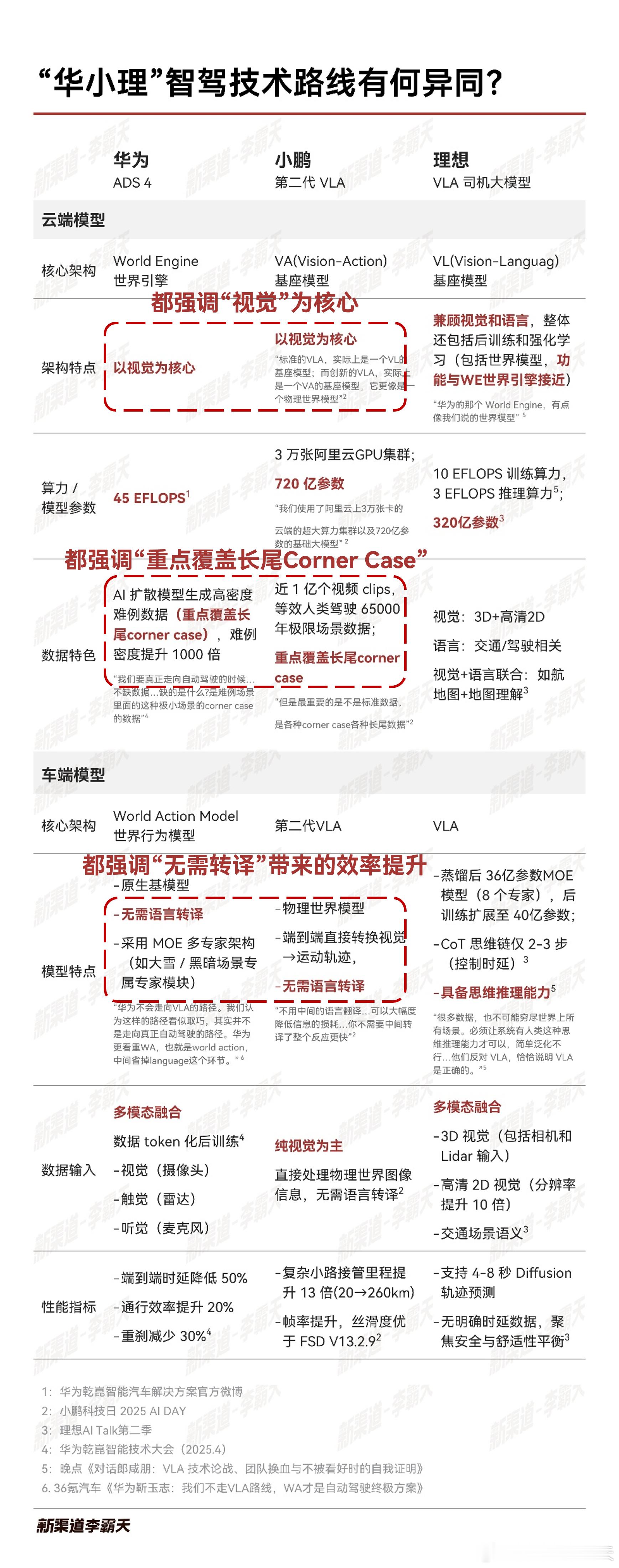 我根据公开的访谈和发布会资料,整理了一下三家智驾路线的对比分析,在这里分享给大家。