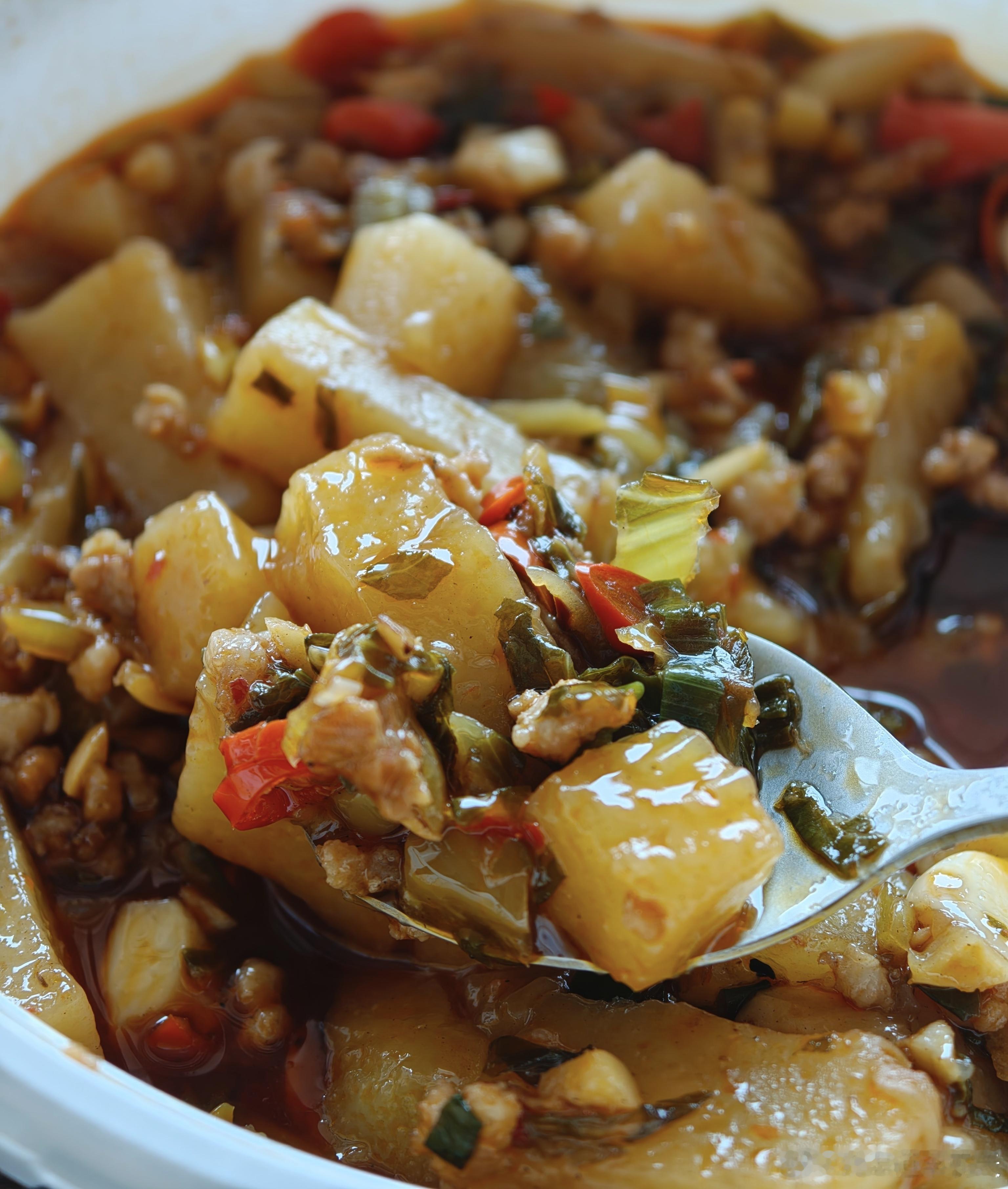 在湖南,米豆腐常做素炒或窜汤,两种做法我都爱,关键是一定要加酸菜,它可是这道菜的灵魂,酸酸辣辣,很爽口~