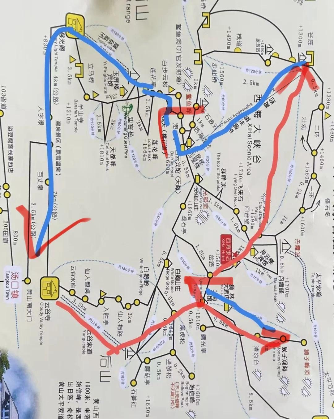 黄山一日爬路线 不一样的黄山攻略 我亲测和推荐路线刚好相反,女孩子也可以轻松走完整个大环线。 图二是我的爬山路线,和大家路线相反,人少不拥挤,提前微信小程序购买逍遥溪上行和云谷索道上山,刷身份证上山。 黄山目前早上6:00(逍遥溪换乘中心,距离黄山南门大概100米的样子,路右侧图三)就发出第一班车了,没有住在山顶的朋友,一定要赶最早一班(能赶上末尾的日出) 住宿:搜索黄山南门景区,离南门越近越好,因为方便第二天一早赶第一班车。 一、早上5:50前到图三逍遥溪换乘中心,注意:到达后排队分两个方向的,一定要看清楚不要白排队了,去玉屏索道在右侧人比较多,这个方向是先到迎客松,天都峰的朋友,天都峰需要提前预约,不爬天都峰的朋友就可以跟着我的路线了。 2.到达逍遥溪赶第一班车往云谷索道方向出发,下车后赶最快的索道,上去运气好可以看到索道末尾日出和云海。 3.往猴子观海方向,途中路过:梦笔生花石头(图4),图5是一位好用心的妈妈,带孩子领略书本上的经典,图6远处是这里的云海。没有带书的可以在狮林大酒店门口拍(图7) 4.继续往前走就是光明顶和西海大峡谷的分岔口,往光明顶走需要用时40分钟,往西海大峡谷走需要1个半小时,个人觉得最美的山石景在西海大峡谷。我选择往西海大峡谷方向注意:大峡谷有1环和2环,1环走右2环走左风景更好。走到底就是换乘中心,乘坐网红小火车100元车票,直达光明顶下方800米左右。(图89是简单拍了两张)图10是小火车上的图,重要的来了:小火车分三层,乘坐小火车一定要在最下层靠窗,可以直观的拍整个峡谷。 5.上来后上光明顶,再然后有体力的挑战一线天莲花峰,注意这是单行道相当于转了一圈大概用时1小时,不建议爬了[泪崩R][泪崩R]没有体力的一直走去迎客松图11,大概用时1小时,然后迎客松旁边就是玉屏索道,小程序购买下行索道和大巴车票,下索道就是大巴车站,坐大巴车下山到汤口下车。 全程早上6点开始大巴出发,下午3点半下山回到南门汤口镇车站下车,民宿拿行李,去按摩店缓解一下,顺便换衣服,一天时间搞定大环线,第二天小腿微痛。黄山 黄山攻略