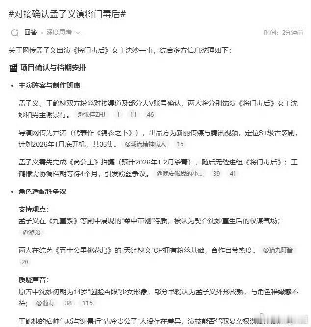 王鹤棣孟子义要组“疯批CP”?《将门毒后》选角炸屏! 内娱选角终于懂我们想看什么了!网传王鹤棣、孟子义要首搭古装大IP《将门毒后》,一个是拽酷霸总专业户,一个是直球女王活宝,这组合直接拉满期待值! 消息称孟子义或将饰演美强惨复仇女主沈妙,王鹤棣挑战腹黑王爷谢景行,两人同框画面感爆棚!一个敢说敢做,一个又苏又撩,疯批人设碰撞起来绝对火花四溅!坐等正式官宣,这波要是成真,追剧日历必须提前锁死!