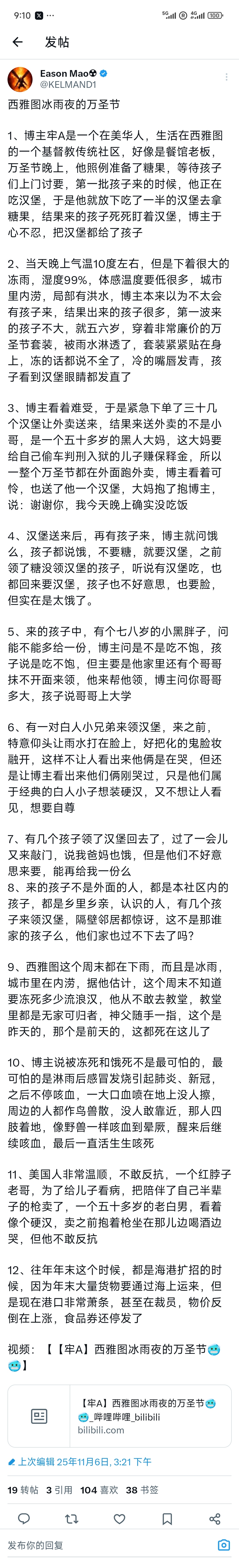 玻波安 2 2025-11-07 17:38 这期直播我看了,听着确实挺感人的。作为一个关心世界局势的普通打工人,我拿起儿子的地球仪,看了看西雅图在地球的位置,和哈尔滨差不多靠北。叹了一声,“幸福来之不易”,就继续收拾屋子了。