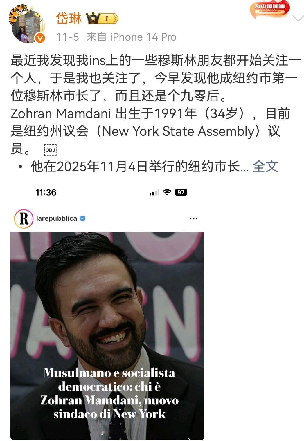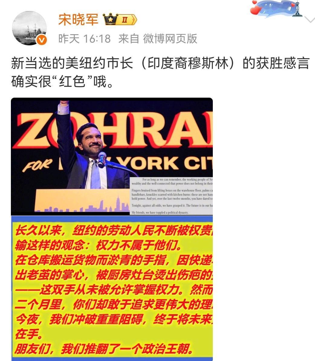 美国民主党的新希望,纽约市长。 (如图所示)美国最大的都市纽约以压倒性的优势,选出民主党的新市长马姆达尼,他身上的标签太多了:90后,34岁当选,是纽约百年来最年轻的市长,穆斯林、印度裔、出生在非洲乌干达、号称民主社会主义者、嘻哈歌手出身。美国民主党的传统政客们已经无力和共和党总统特朗普角逐,只能把希望寄托于新人之上了。