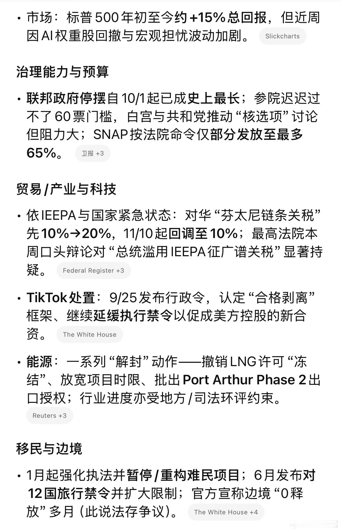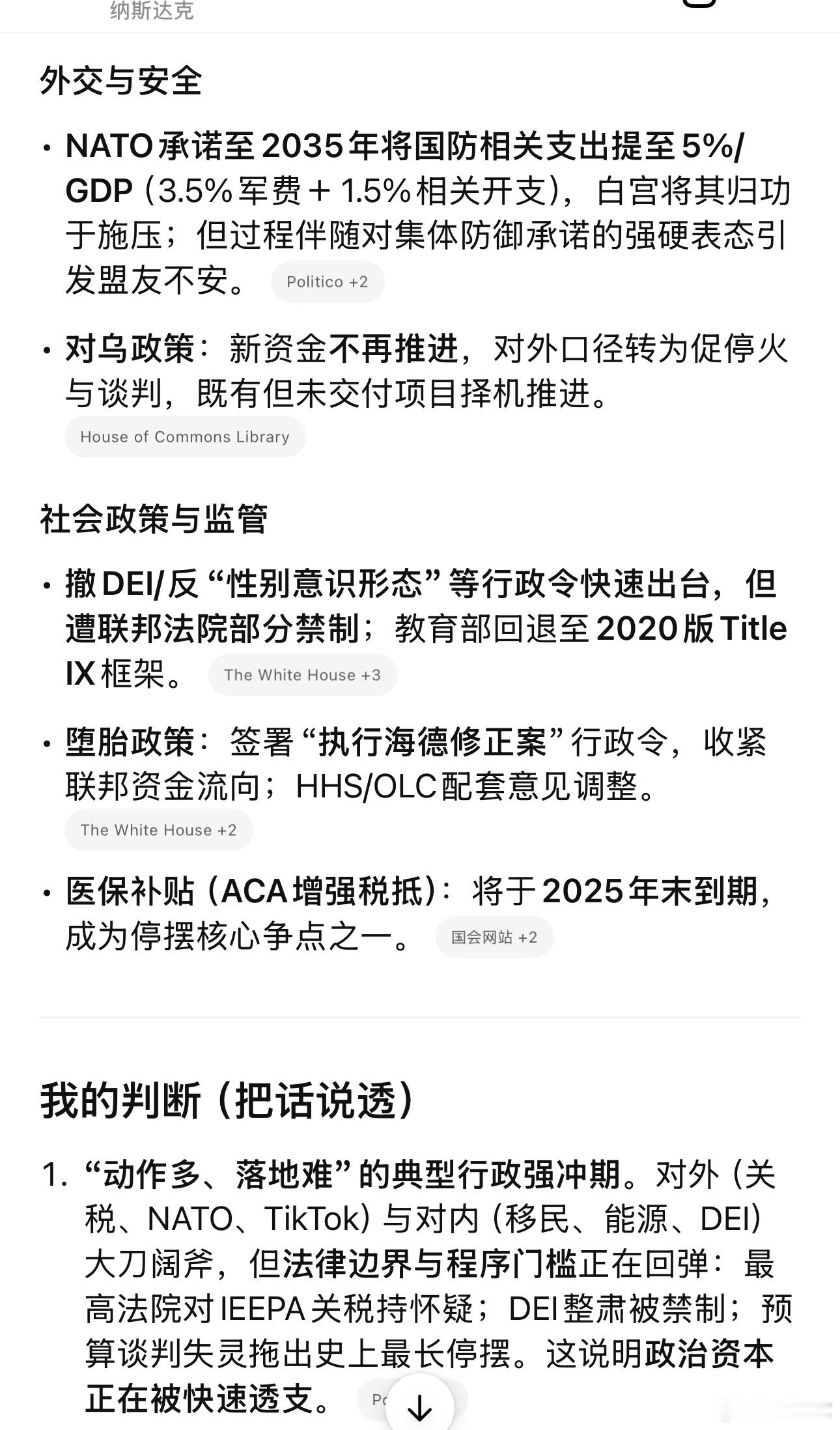 1. “动作多、落地难”的典型行政强冲期。对外(关税、NATO、TikTok)与对内(移民、能源、DEI)大刀阔斧,但法律边界与程序门槛正在回弹:最高法院对IEEPA关税持怀疑;DEI整肃被禁制;预算谈判失灵拖出史上最长停摆。这说明政治资本正在被快速透支。