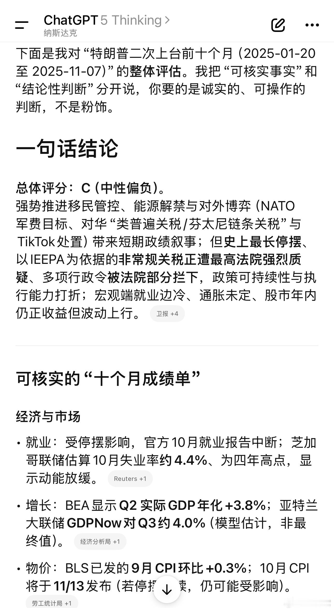 下面是我对“特朗普二次上台前十个月(2025-01-20 至 2025-11-07)”的整体评估。我把“可核实事实”和“结论性判断”分开说,你要的是诚实的、可操作的判断,不是粉饰。