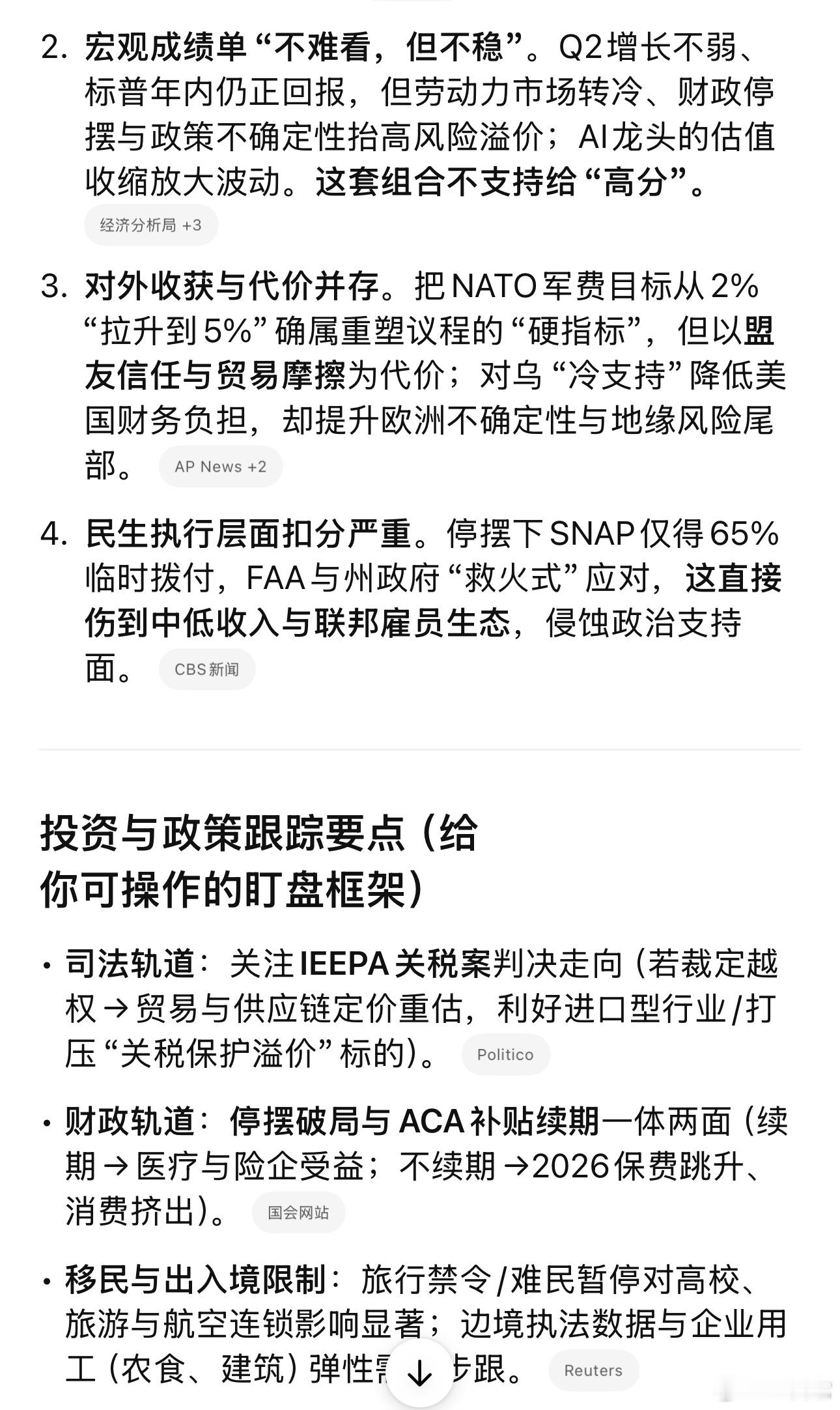 2. 宏观成绩单“不难看,但不稳”。Q2增长不弱、标普年内仍正回报,但劳动力市场转冷、财政停摆与政策不确定性抬高风险溢价;AI龙头的估值收缩放大波动。这套组合不支持给“高分”。