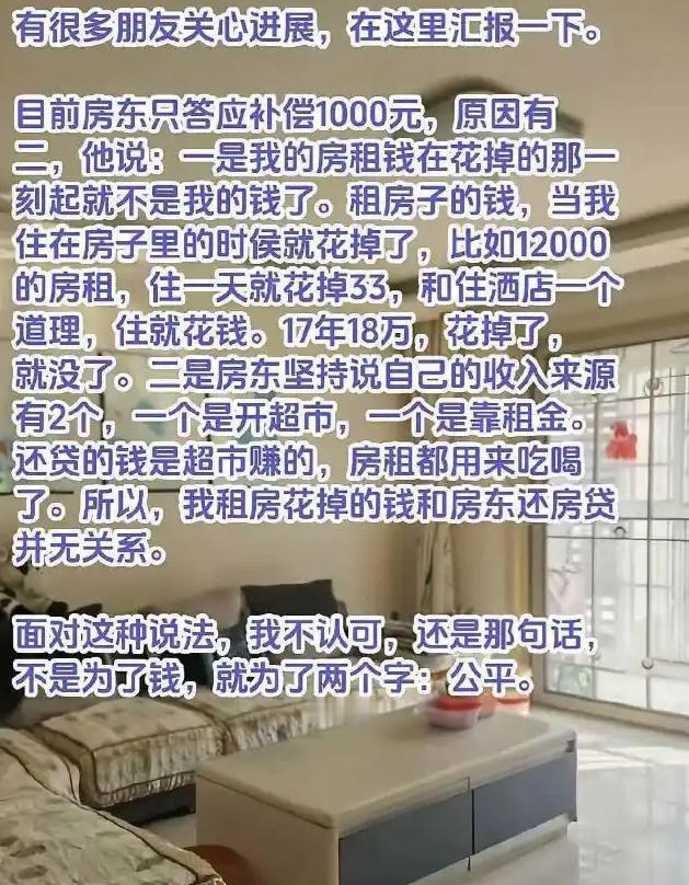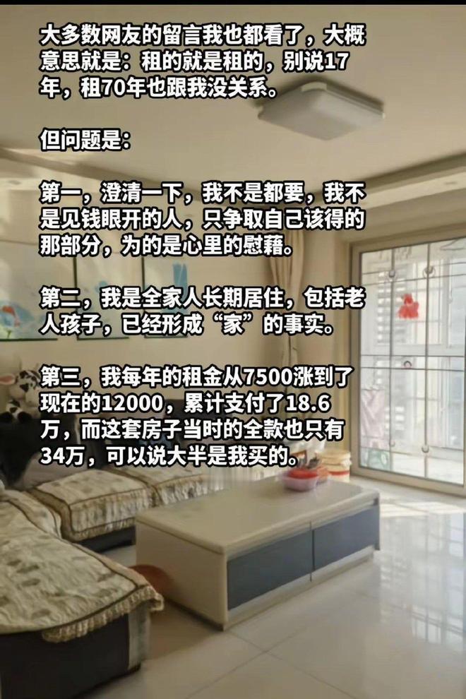 活久见!山东一租客租了17年房子,房东要卖房,她要求分一半房款。 青岛最近发生了一件让人大跌眼镜的事,租客张女士租了一套房子整整17年,如今房东要卖房,她却提出要分150万房款,理由是自己这些年交的租金早就抵了房子当初的本钱。 事情得从2008年说起,张女士当时租下这套房,租金从最初的每年7500元慢慢涨到了12000元,17年下来累计交了18.6万租金。 这套房子当年全款才34万,现在市值已经涨到300万,张女士觉得自己交的租金快赶上房价的一半,相当于帮房东还了大半房贷,理应拿到一半卖房款。 更让人大跌眼镜的是,她把房东当年一句“房租当还房贷”的玩笑话当真,坚称自己不是贪钱,只是在争取应得的权益,寻求心理慰藉。 她还强调全家老小都在这房子里长期居住,早已形成“家”的事实,自己的诉求合情合理。 可稍微琢磨一下就知道,张女士的这些理由全是站不住脚的谬误。 首先租金本质是房屋使用权的对价,她交的每一笔钱,换的都是对应时间段的居住权,跟产权半毛钱关系都没有。 17年18.6万租金,平均每年才一万出头,在青岛这样的城市,这个价格能长期租住一套适合全家居住的房子,已经算是很划算的了。 然后是她把“长期居住”和“产权归属”混为一谈,住得久有感情不代表房子就有自己的一份,就像常去的公园逛了二十年,也不能说公园归自己所有。 最后,那句口头玩笑既没有书面协议佐证,也不符合法律上的契约要件,根本不能作为索要产权的依据。 这件事传到网上后,网友们的反应五花八门。 不少人直言张女士的思维逻辑不正常,正常人都不会把租房和分房产联系到一起。 还有人编了各种调侃的段子,说要是这个逻辑成立,银行员工在银行干了三十年,是不是该分银行三分之一的股份。 理发店老板租了二十年店面,交的租金远超当初房东的购房款,是不是该让房东把店面拱手相让。 更有不怕事大的网友假装支持,开玩笑说等张女士赢了就去北京租套房,住满十七年也去分一半产权。 这些声音看似滑稽,却一针见血地指出了诉求的荒谬之处。 说到底,张女士的核心问题还是认知上的严重不足。 她混淆了“消费”和“投资”的概念,把租房这种消费行为当成了购房投资,忽略了房东这些年承担的房屋维修、税费缴纳、房价波动等风险。 她只看到自己交了十几万租金,却没意识到房东拥有产权就要承担相应的责任,房价下跌的亏损、房屋老化的维修费用,从来都不需要她来分担。 她对法律和产权的认知几乎是空白,不知道不动产物权需要依法登记才生效,租赁关系再久也不会自动转化为产权关系,更不清楚优先购买权和直接分房款是完全不同的两回事。 希望这件事能给大家提个醒,不管租房还是买房,都得把权利义务搞清楚,别让情感冲昏了头脑,更不能无视法律和规则的边界。