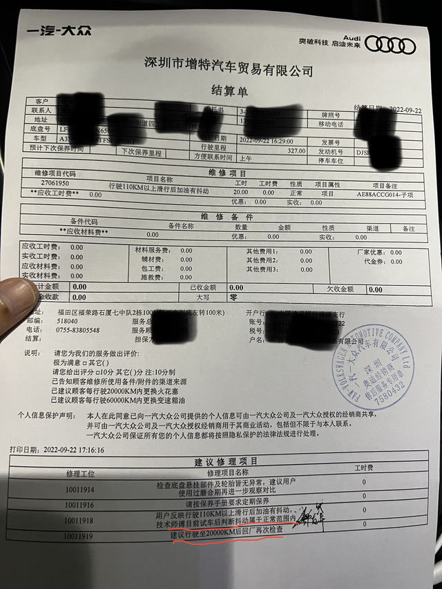 提奥迪A3问题车辆,增特无法检测出问题 9月20日在福荣路增特奥迪提22款燃速型A3 sportback两厢车,下午上了高速,在时速110KM以上时,车子抖动很厉害,立马发信息联系店里建立的售后群,叫我后面开回去检查。(提车前无法开到110以上;要外出,无法立即返回。) 9月22日返回深圳的途中,经在高速测试,应是在高速度滑行时,再加油,车子就抖动得很明显。(速度高于90以上时特别明显,60到90滑行再加油也有点感觉,没那么明显,这我就完全没提了。) 22日9时50分左右到增特奥迪4S店,和他们的一名技术工人1上高速试车。工人1一下就试出上述所反馈的问题。后开回店里,让其他工人对车子进行四轮定位调整,期间我去休息区等待,一直到下午16时左右,通知我去拿车,车子被试了接近80公里(总里程320+到400+),燃油表掉了两格,我都不知道他们怎么暴力驾驶。后与他们的另一名技术工人2上高速试车,结果110-120以上滑行再加速车子还是存在一定的抖动。而他们工人2咬定车子没过磨合期,这些都是正常现象。(试了一天就得出这个结论) 期间一直跟他们争论,我提出要么把车子修好,要么退换车。销售说,走退换车就按国家三包政策走。而他们的售后,工人居然认为,只要车辆没出故障码,机械没问题,车子就是没问题。高速加速抖动都不算是问题。技术工2还承认,去其他店试其他5辆A3,没有这个问题,才认我这个是存在问题