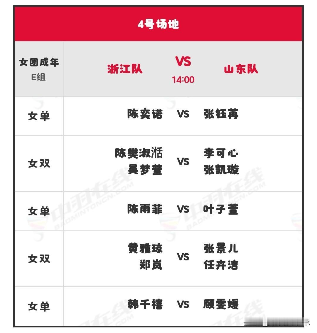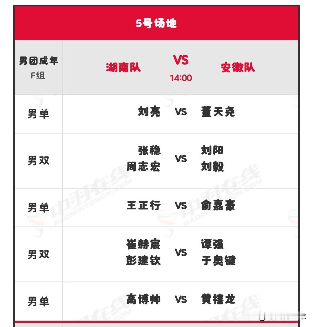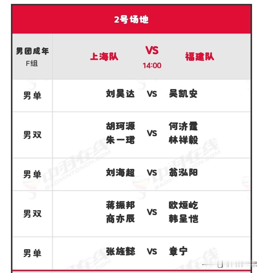 11月7日全运会羽毛球赛团体决赛下午场安排 北京时间14:00开始,共有六块场