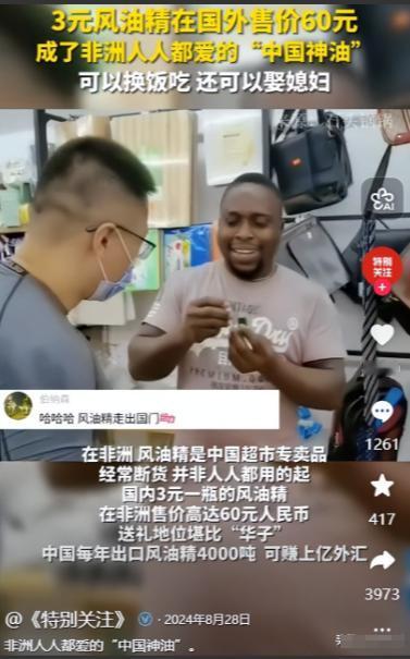 一年57万人死亡!中国风油精成“救命稻草”,涨价20倍仍卖爆非洲。 谁能想到,国内药店随手就能买到、价格只要几块钱的小物件,在非洲能身价暴涨 20 倍,还被当成提亲时的硬通货?这个让非洲人疯狂追捧的 “宝贝”,正是很多中国人记忆里的风油精。 全球有超过 40 亿人每月收入不到一千块,对他们来说,花哨的功能和高昂的价格都不实用,能实实在在解决问题的便宜好货才最受欢迎。 中国风油精恰好踩中了这个需求点,在非洲市场掀起了热潮。尼日利亚、肯尼亚、坦桑尼亚是非洲进口风油精最多的国家,仅尼日利亚就占了非洲总进口量的四分之一。 2023 年,中国向非洲出口的清凉油、风油精类产品,年出口额已经达到 1.2 亿美元,占全球同类产品出口量的 35%,而且每年还在以 8% 到 10% 的速度稳步增长。 非洲人对风油精的依赖,源于当地难以回避的生存困境。这里的蚊子不仅数量多,毒性还特别强,被叮咬后不仅会起又红又肿的大包,还可能感染疟疾。 2023年,非洲疟疾形势严峻。疟疾病例多达2.46亿例,占全球总数的94%;死亡病例近57万人,几近囊括全球95%的疟疾死亡人数,凸显该地区防控疟疾任务之艰巨。 更令人揪心的是,非洲肩负着全球 22% 的疾病重荷,所拥有的医护资源却仅占全球的 3%。 在此,看病难、看病贵成了普遍痼疾,民众深受其苦。极端天气增多,为蚊子造就更多繁殖地,疟疾传播风险与日俱增。 在此情形下,马拉维、莫桑比克等国的疟疾病例呈持续上升态势,防控形势愈发严峻。在这种情况下,能防蚊驱蚊的产品,对非洲人来说就是 “救命稻草”。 风油精的弱酸性配方能中和蚊子分泌的碱性毒液,被咬后涂上很快就能消肿止痒,里面的薄荷脑和桉油带来的清凉感,在四十多度的高温天里更是难得的慰藉。 一瓶风油精仅需约6美元,相较动辄几十乃至上百美元的西药,其性价比之高令人惊叹。如此一来,风油精理所当然地成为了非洲人的首选。 在非洲,风油精的用法被开发得五花八门,还带着明显的地域特色。埃塞俄比亚人喜欢在冲好的咖啡里滴几滴,说这样提神效果能翻倍; 马达加斯加的民众会把风油精抹在假发上,既能预防头皮瘙痒,又能驱蚊降温,还能掩盖体味;撒哈拉以南的地区,很多人把它当成日常防暑用品,随时拿出来涂抹;还有些地方的人会直接口服或者对着瓶口猛吸,感受那种直通天灵盖的清凉感。 于非洲,风油精所承载的远非实用功能这般简单,它早已跨越了药品的固有范畴,在当地的社会生活中扮演着更为多元且独特的角色。 去景点忘带钱,掏一瓶风油精可能就能抵门票;饿了想换点吃的,用风油精换一顿饭也不新鲜。年轻人提亲时,要是能拿出几瓶风油精当彩礼,女方家会觉得这个女婿 “有门路”,甚至会把这当成跻身更好社会阶层的象征。 风油精能在非洲站稳脚跟,还离不开难以复制的核心优势。其配方属中国国家保密技术,加之生产中积累的隐性工艺,像薄荷脑提纯度、桉油萃取温度控制等,这些环节稍有差池,最终效果便会有天壤之别。 印度曾经尝试仿造,可造出来的产品被非洲消费者一眼识破,都说味道和清凉感都差远了。再加上中国企业的规模化生产,比如有的药厂一年能生产 13 亿瓶,靠薄利多销摊薄成本,让其他国家很难在价格上竞争。 除了华为、大疆这些靠技术实力赢得世界尊重的高科技产品,老干妈、六神花露水这些看似普通的小商品,也在用实用和贴心征服全球市场。 这两条腿并行的出海路径,让中国制造既有着让人敬畏的技术高度,也有着贴近生活的温度,慢慢让 “中国化” 融入全球化的每一个角落。