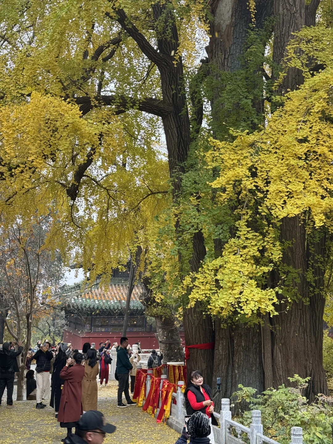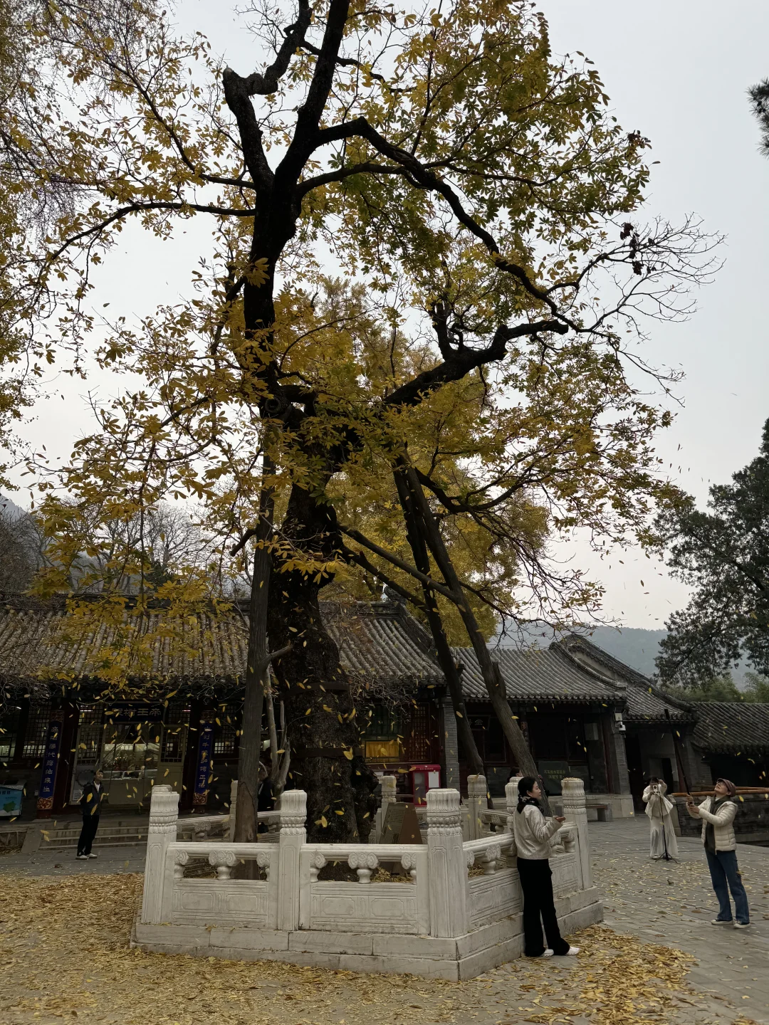 今天探了4个千年/百年的古银杏(寺庙) 其中潭柘寺,一定是顶流 从震撼性,观赏性上,比昨天去的大觉寺要美多了 不过从构图,出片,大觉寺场景更多。 尽管今天阴天,我拍照不行,但他还是很美! 分享这几点吧: 1.潭柘寺树龄两种说法,1310年(树牌写的),和1400年(旁边介绍写的)(自己和自己矛盾了) 2.之所以叫帝王银杏树,和每诞生一位皇帝有关。(当然,树大小上也是王者,北京能进前三吧) 3.更重要的是,这里的叶子很茂盛,现在黄透了,风稍微一吹,就能下银杏雨,简直美呆了。图2-3是live图。 [合十R][合十R][合十R](估计周五周六,银杏雨更大,有时间我还去,周天天晴,应该是最美的时间了。下周前几天还行,下周末肯定秃了 4.先有潭柘寺,后有北京城 在这里,几百年的树都是弟弟,有几百年的竹林,几百年的牡丹,几百年的探春,娑罗树,还有百事顺利(几百年的柏树和柿子树环绕在一起)。 这里真是植物鉴古! 帝王树旁边还有一颗千年的配王银杏树,可惜两颗都是雄的。 5.今天我是早上9点到,进来还不堵车,11点半逛完出去,停车场排满了,堵了半条街。 6.整体逛2-3小时没问题。 我赶着踩点留离开了,但真没待够,太美了。 我刚看到时,不由得抽搐了几下,眼泪留下来了。 人生太苦了,为什么有工作这玩意,谁发明的。我二十岁最美好的年龄都在格子间度过了。这可是我最美好的时间呀,我的青春。这么好的季节,景色,不应该来看,来发呆吗?我在北京待了10年,第一次来潭柘寺看到这景。 (好,神经发完了,反正以后时间都可以拿来看美景,拿来浪费。) 7.补充下,最大的这棵帝王银杏树,工作人员说大概还能支撑7天,周五的雨影响应该还好。下周三四是边界点,现在也已经开始掉了。 旁边的配王银杏树,还不太黄,也没怎么掉。但不太大,下周末还可以看。 不过这里在门头沟郊区,来的大部分本地人,外地游客少,我过来一趟来回也要170公里! Over,我今晚陆续发下其他3个地方实况。 明天去故宫,中山公园。