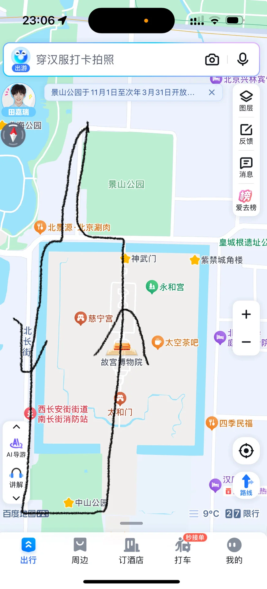 好多年没去故宫了 这次赶个秋吧! 中山公园,故宫正是银杏最佳时间 不知道北京这场深秋雨之后 银杏还能剩下多少! 另外,上次去了中山公园就很头疼,停车位都太远了,要来回走。 这次我想走完中山公园,打卡故宫西华门,角楼,并走完故宫。 车打算停景山,这一圈太绕了。有啥建议吗? (图2计划路线,要停一天。停车费也好贵啊) 另外 1.这几天,中山公园,故宫排队久吗? 2.现在从中山公园东门出,可以去故宫午门吗?我还没约天安门。 3.最后希望雨天,人少些