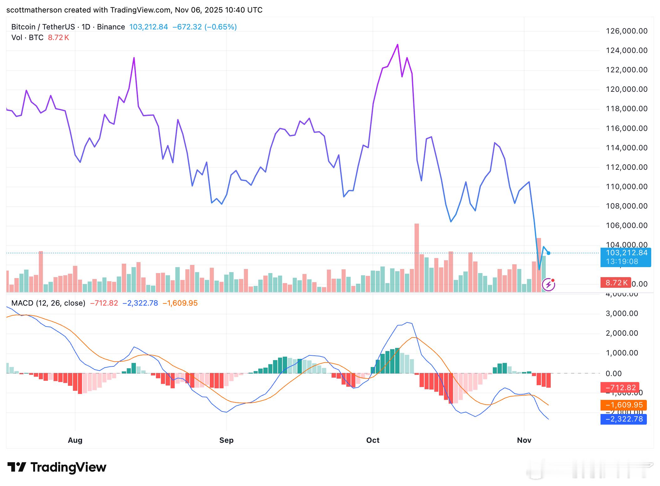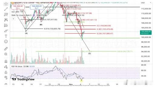 图表显示,关键阻力区在 103,400-104,900 美元,交易量下降,市场仍处于超卖状态,这意味着底部可能很快出现,但稳固支撑需要几天时间⏳。