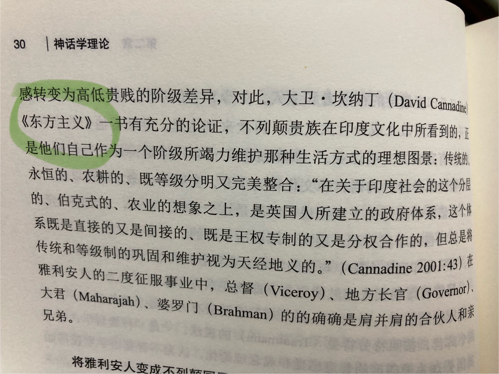 《神话学理论》这两处引用的是同一本书:David Cannadine 《Ornamentalism》,今年刚出的中译本题作《帝国作为装饰品》。译者在几页后书名第二次出现时,大概眼花看成orientalism(东方主义),编辑亦失察