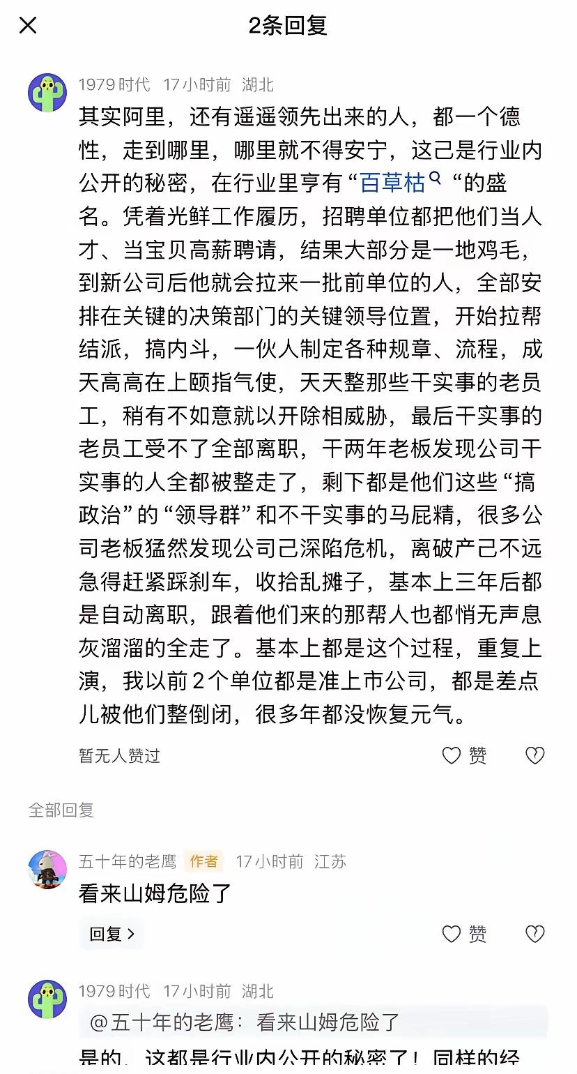 三姆管理层被阿里全面渗透,有人评论说,阿里和遥遥领先出来的管理者都一个鸟样,行业人称“百草枯” 百草枯[捂脸]这他妈是形象吗?还是悲哀?