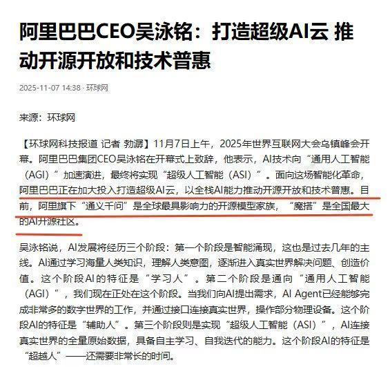 在这场规格极高的顶级盛会上,阿里巴巴又被点名了! 11月6日,阿里通义千问大模型获得世界互联网大会“领先科技奖”,这是来自行业的顶级认可。 然后11月7日,世界互联网大会乌镇峰会正式开幕,阿里巴巴集团CEO吴泳铭作为嘉宾进行致辞,他提到阿里巴巴通义千问在模型性能上全球领先,而且已经成为全球最具影响力的开源模型家族。 不得不说,阿里巴巴在大模型发展上确实有足够的底气和实力。阿里是国内最早开始大模型研发的互联网科技企业之一,这些年凭借着在云计算及AI技术上的深厚积累,迅速跻身全球第一梯队。 要知道,截至目前,阿里通义已经开源了300多款模型,全球下载量突破6亿次,成为“全球顶流”大模型。 此前国际调研机构沙利文发布的报告也验证了这一点,今年上半年,阿里通义是中国企业选择最多的大模型,在中国企业级大模型调用市场中份额第一。 比如基于阿里通义千问大模型,中国银联打造出了金融领域支付垂域大模型,国家天文台发布了全球首个太阳大模型“金乌”,太阳预报方面的能力是最顶尖的。 不只是国内企业,英伟达、微软等国际知名企业也基于通义千问开发衍生模型,还有阿联酋、日本、东南亚等多国也在借助通义千问的技术推进本地化应用。 我想说的是,这一次中国技术真正做到了风靡全球。但这并不是终点,吴泳铭说,面向未来,阿里要以全栈AI能力推动开源开放和技术普惠。也就是说,要让更多人包括弱势群体在内,都能用AI创造更美好的生活。这也是社会公众对阿里的期待!