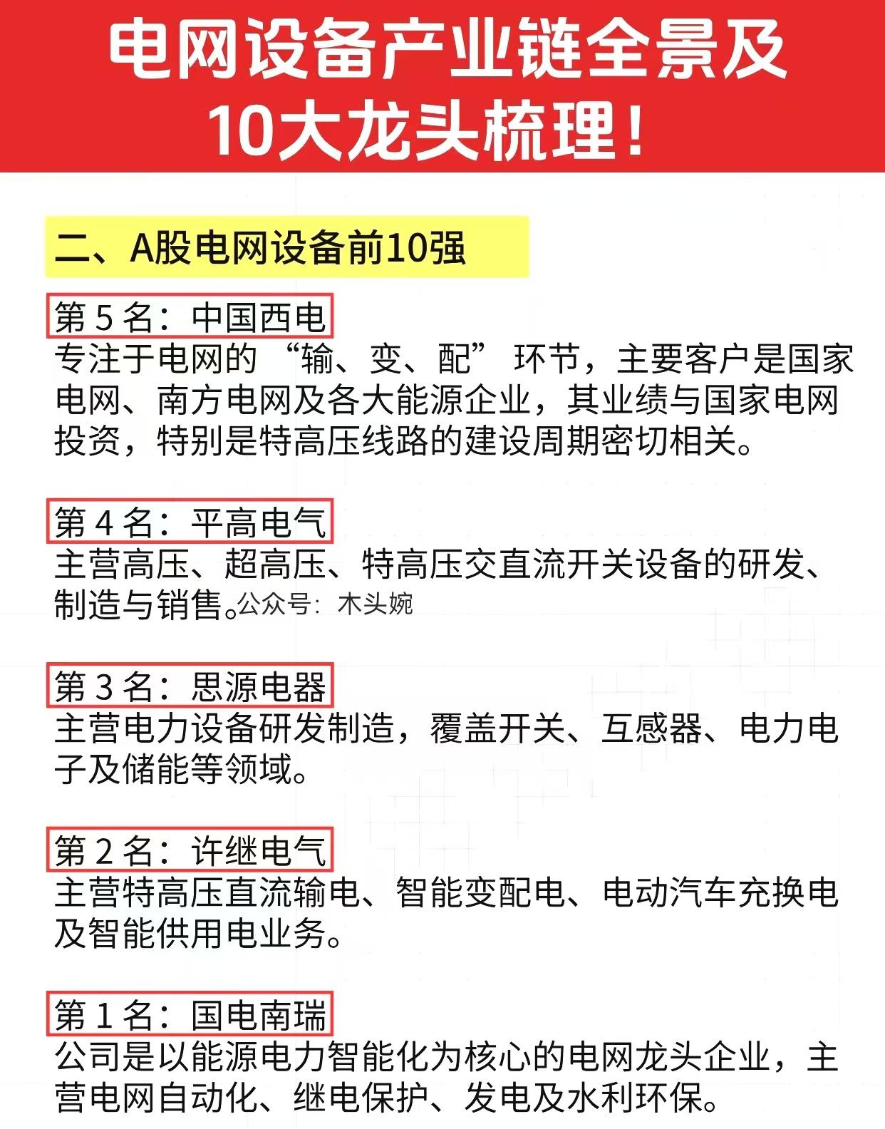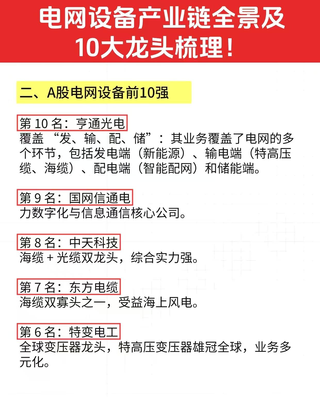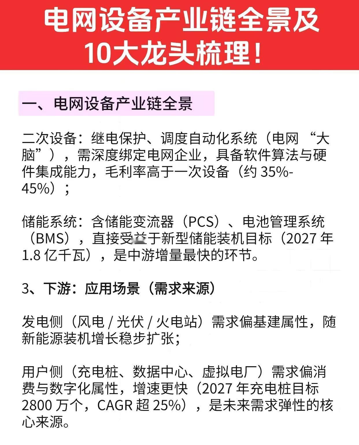 电网设备十大核心龙头梳理 算力的尽头就是电力,电网设备是AI在能源领域落地的核心支撑。人工智能发展加剧全球电力供应压力,数据中心对能源使用质量要求提升,将带动配用电领域投资需求增长……想知道电网设备行业的投资逻辑和企业竞争力?这篇产业链全景+龙头梳理,带你一探究竟! 电网设备概念十大龙头代表:中国西电、许继电气、特变电工、国电南瑞、亨通光电等等。 中国西电是高压输配电设备制造业龙头,国电南瑞以能源电力智能化稳居榜首,许继电气在特高压直流输电领域实力硬核,特变电工的变压器技术雄冠全球,东方电缆、中天科技在海缆赛道二分天下…… (理财有风险投资需谨慎,资料取材网络仅供参考)