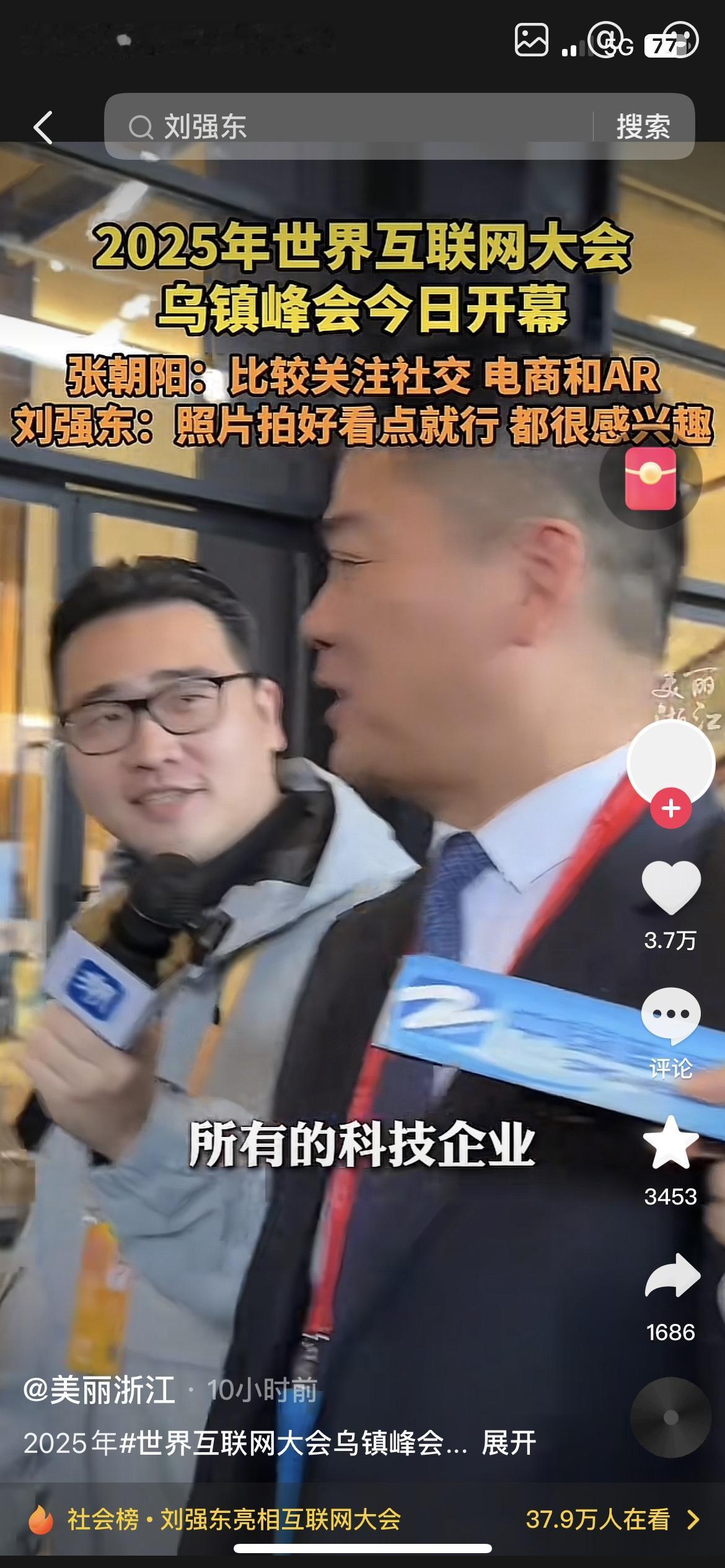 东哥在乌镇是来整活的吧?说以后快递自己开门进家,打工人一周干1小时就行 刚刷到乌镇互联网大会的视频,刘强东这发言也太敢说了! 记者堵着问他关注啥技术,他笑着说“把我照片拍好看点”,转头演讲直接放猛料: 以后快递机器人能自己开你家门,把包裹放你家沙发上; 员工更狠,一周上班1天就算多的,搞不好只干1小时。 张朝阳还在那聊AR聊电商,东哥直接把打工人梦想给说出来了…就是想问:这机器人送快递,我家猫要是挠它算谁的?还有那一周干1小时的活儿,能内推我不?[笑哭] 你们说这事儿真能成不?我先蹲个名额。乌镇 桐乡互联网大会 东哥演讲