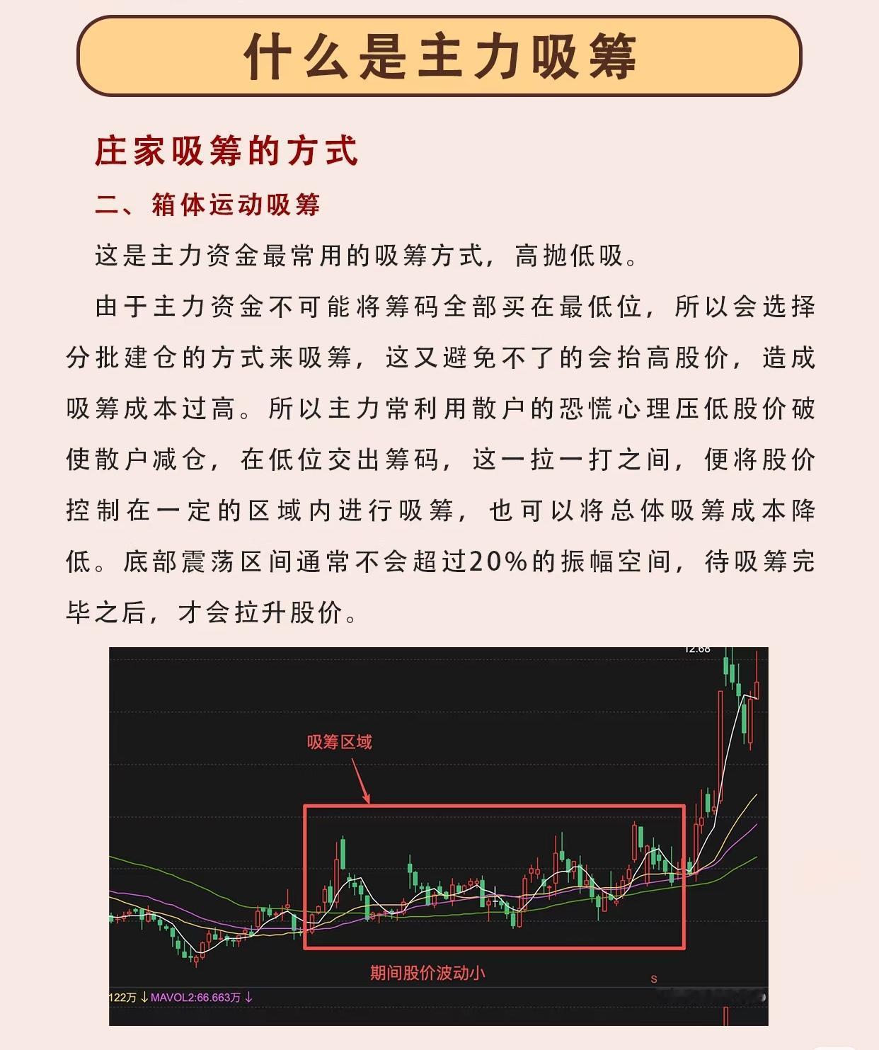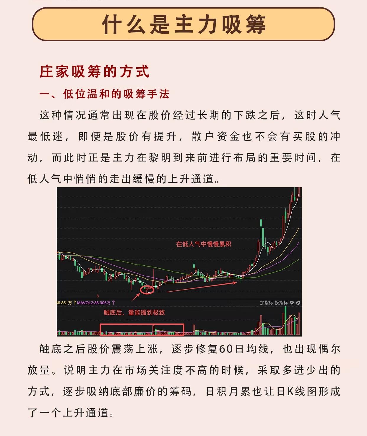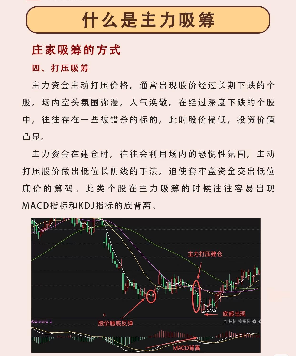 什么是主力吸筹,以及主力(庄家)在股市中如何通过各种方式吸筹建仓。 一、什么是主力吸筹? 主力吸筹是指在股市中,庄家(主力或大户)为了控制某只股票的未来走势,在一段时间内持续地、有计划地买入股票(即建仓或加仓)的过程。 - 主力通常是资金量大、信息灵通、操作技术强的机构或个人投资者。 - 散户则是资金少、分散、跟风者众,难以对股价形成显著影响。 - 核心逻辑:投资市场是一个“资金为王”的地方,谁掌握的资金多,谁就能更大程度地影响股价。 二、主力吸筹的时机与原则 1. 吸筹时机 - 只有当大盘或个股接近底部,或外部经济环境有好转迹象时,主力才会开始吸筹建仓。 - 如果过早吸筹,成本过高;如果过晚,则可能来不及收集足够筹码,或成本同样被推高。 2. 吸筹成本 - 吸筹的成本取决于吸筹的方式,不同的策略会导致不同的持仓成本。 3. 吸筹方式(重点!) 图片详细介绍了五种最常见的主力吸筹手法,每种方式都有其特点、适用场景及对应的K线与成交量特征: 三、主力吸筹的五种常见方式 1. 低位温和吸筹 - 适用情况:股价长期下跌后,人气极度低迷,市场关注度低。 - 主力行为:趁低关注度,以“多进少出”的方式,在低位缓慢吸筹,形成缓慢上升通道。 - K线特征:触底后震荡上涨,成交量缩至地量后逐渐修复均线(如60日均线),偶尔放量。 - 目标:在不引人注目的情况下,积累廉价筹码。 2. 箱体运动吸筹(波段区间吸筹) - 适用情况:主力在某个价格区间内,通过高抛低吸、分批建仓的方式进行吸筹。 - 主力行为:利用散户恐慌心理,通过打压股价让散户割肉,从而在低位获得筹码。 - K线特征:股价在一定范围内反复震荡(振幅通常不超过20%),底部区域吸筹,待筹码足够后才拉升。 - 核心:控制吸筹成本,避免一次性在高位接盘。 3. 拉高抢筹 - 适用情况:当个股出现突发性利好消息,或股价被严重低估,但尚未被市场广泛认知时。 - 主力行为:大资金(如游资)在短时间内大量买入,甚至不惜拉涨停板,迅速收集筹码。 - K线特征:股价快速上涨,伴随成交量明显放大,尤其是涨时放量、跌时缩量,是主力扫货的典型信号。 - 目标:抢在他人之前,迅速完成建仓。 4. 打压吸筹 - 适用情况:股价经过长期大幅下跌,个股被市场错杀,具备投资价值但人气极度低迷。 - 主力行为:利用市场恐慌情绪,主动打压股价,制造恐慌,逼迫套牢盘割肉,从而在低位吸取廉价筹码。 - K线特征:出现长阴线、股价快速下探,但往往伴随着MACD、KDJ等指标的底背离现象(即价格创新低,但指标未创新低,暗示下跌动能减弱)。 - 目标:在极度悲观的市场氛围中“捡便宜”。 5. 横盘吸筹 - 适用情况:主力选择在股价相对低位进行长时间横盘整理,通过时间换空间的方式吸筹。 - 与箱体吸筹的区别:横盘吸筹的波动空间更小,通常没有明显的上下震荡,更考验投资者的耐心。 - 主力行为:通过长时间横盘,让投资者失去信心,很多散户因看不到上涨希望而抛售,主力则趁机吸纳。 - K线特征:股价长期在一个窄幅区间内横盘(如三个月以上),成交量较低,看似毫无机会,但一旦吸筹完毕,往往迅速拉升脱离平台。 - 核心:以“静”制动,隐蔽吸筹。 四、主力吸筹的鉴别特征(结合K线与成交量) - 成交量突然放大:主力开始进场时,往往会出现成交量明显放大的情况。 - 股价下跌但不破前低:即使短期股价回调,但始终不跌破重要支撑位或前期低点,说明有资金在托底。 - 股价震荡或横盘,但重心略有上移:主力在默默吸筹过程中,可能不会让股价大涨,但会通过小阳线、温和放量等方式逐步推升股价。 - 底背离现象:如MACD、KDJ等指标出现底背离,表明下跌动能减弱,主力可能正在吸筹。 - 长时间横盘后突然拉升:横盘很久后,一旦放量突破平台,往往是主力吸筹完毕、准备拉升的信号。