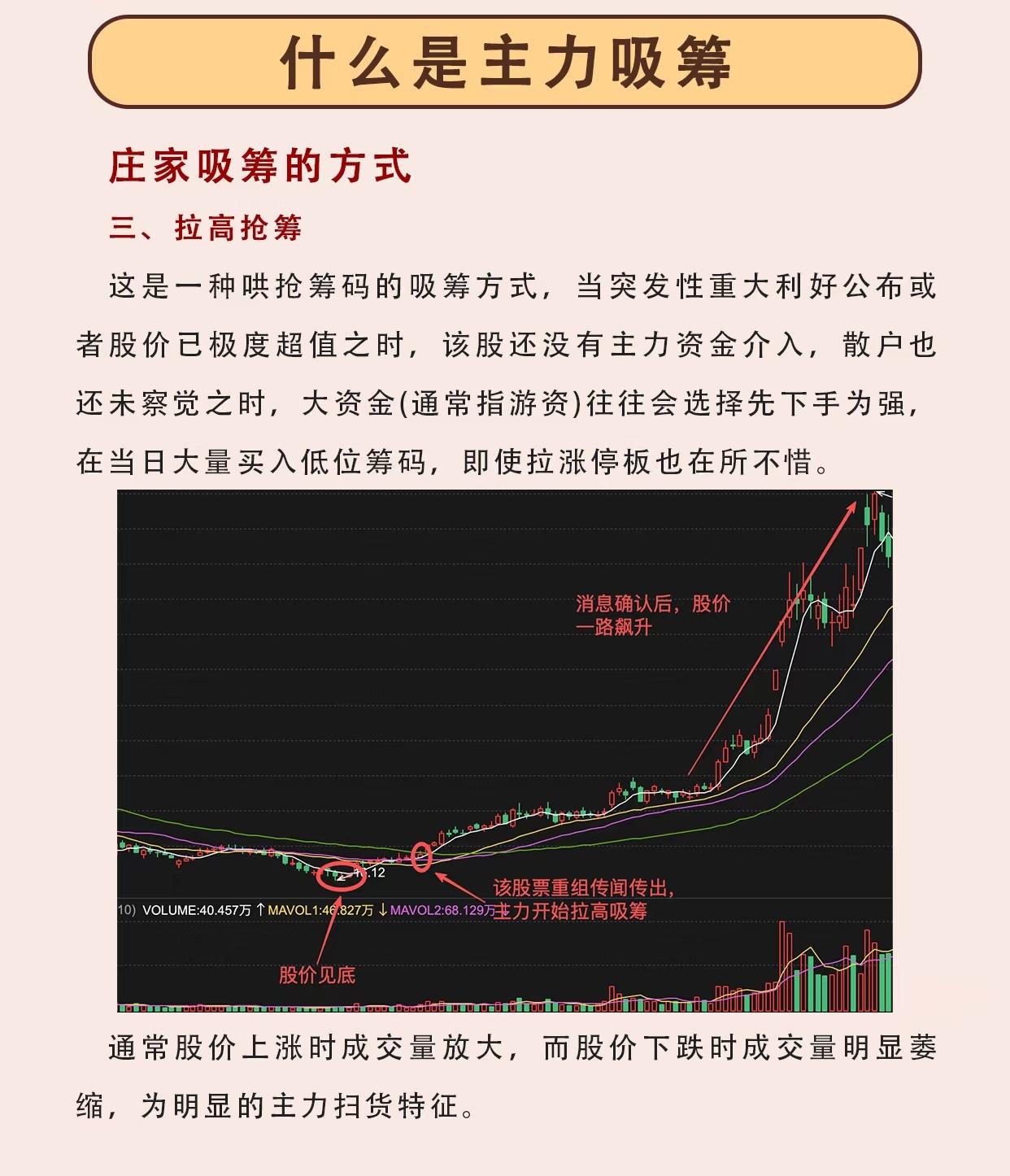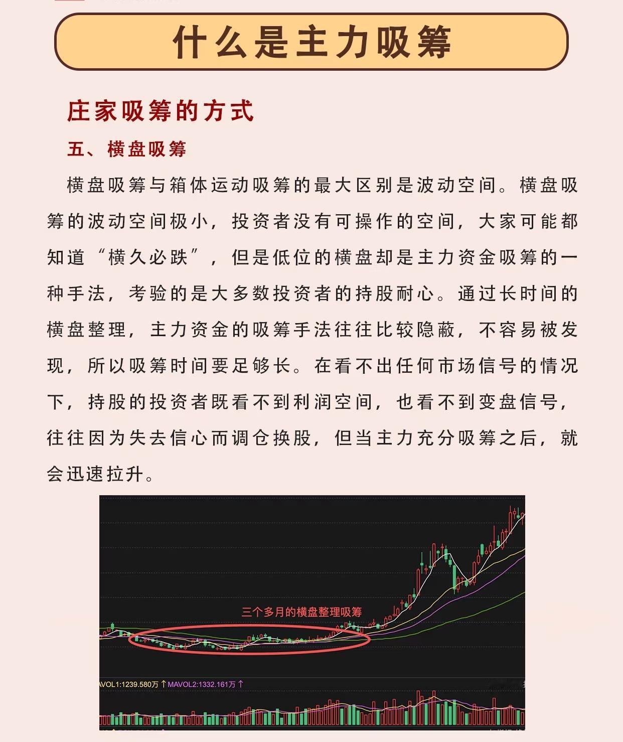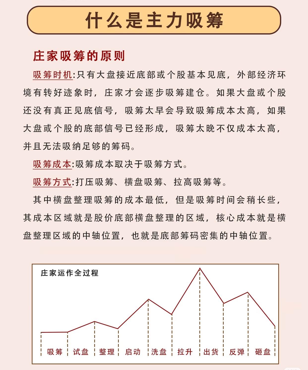 什么是主力吸筹,以及主力(庄家)在股市中如何通过各种方式吸筹建仓。 一、什么是主力吸筹? 主力吸筹是指在股市中,庄家(主力或大户)为了控制某只股票的未来走势,在一段时间内持续地、有计划地买入股票(即建仓或加仓)的过程。 - 主力通常是资金量大、信息灵通、操作技术强的机构或个人投资者。 - 散户则是资金少、分散、跟风者众,难以对股价形成显著影响。 - 核心逻辑:投资市场是一个“资金为王”的地方,谁掌握的资金多,谁就能更大程度地影响股价。 二、主力吸筹的时机与原则 1. 吸筹时机 - 只有当大盘或个股接近底部,或外部经济环境有好转迹象时,主力才会开始吸筹建仓。 - 如果过早吸筹,成本过高;如果过晚,则可能来不及收集足够筹码,或成本同样被推高。 2. 吸筹成本 - 吸筹的成本取决于吸筹的方式,不同的策略会导致不同的持仓成本。 3. 吸筹方式(重点!) 图片详细介绍了五种最常见的主力吸筹手法,每种方式都有其特点、适用场景及对应的K线与成交量特征: 三、主力吸筹的五种常见方式 1. 低位温和吸筹 - 适用情况:股价长期下跌后,人气极度低迷,市场关注度低。 - 主力行为:趁低关注度,以“多进少出”的方式,在低位缓慢吸筹,形成缓慢上升通道。 - K线特征:触底后震荡上涨,成交量缩至地量后逐渐修复均线(如60日均线),偶尔放量。 - 目标:在不引人注目的情况下,积累廉价筹码。 2. 箱体运动吸筹(波段区间吸筹) - 适用情况:主力在某个价格区间内,通过高抛低吸、分批建仓的方式进行吸筹。 - 主力行为:利用散户恐慌心理,通过打压股价让散户割肉,从而在低位获得筹码。 - K线特征:股价在一定范围内反复震荡(振幅通常不超过20%),底部区域吸筹,待筹码足够后才拉升。 - 核心:控制吸筹成本,避免一次性在高位接盘。 3. 拉高抢筹 - 适用情况:当个股出现突发性利好消息,或股价被严重低估,但尚未被市场广泛认知时。 - 主力行为:大资金(如游资)在短时间内大量买入,甚至不惜拉涨停板,迅速收集筹码。 - K线特征:股价快速上涨,伴随成交量明显放大,尤其是涨时放量、跌时缩量,是主力扫货的典型信号。 - 目标:抢在他人之前,迅速完成建仓。 4. 打压吸筹 - 适用情况:股价经过长期大幅下跌,个股被市场错杀,具备投资价值但人气极度低迷。 - 主力行为:利用市场恐慌情绪,主动打压股价,制造恐慌,逼迫套牢盘割肉,从而在低位吸取廉价筹码。 - K线特征:出现长阴线、股价快速下探,但往往伴随着MACD、KDJ等指标的底背离现象(即价格创新低,但指标未创新低,暗示下跌动能减弱)。 - 目标:在极度悲观的市场氛围中“捡便宜”。 5. 横盘吸筹 - 适用情况:主力选择在股价相对低位进行长时间横盘整理,通过时间换空间的方式吸筹。 - 与箱体吸筹的区别:横盘吸筹的波动空间更小,通常没有明显的上下震荡,更考验投资者的耐心。 - 主力行为:通过长时间横盘,让投资者失去信心,很多散户因看不到上涨希望而抛售,主力则趁机吸纳。 - K线特征:股价长期在一个窄幅区间内横盘(如三个月以上),成交量较低,看似毫无机会,但一旦吸筹完毕,往往迅速拉升脱离平台。 - 核心:以“静”制动,隐蔽吸筹。 四、主力吸筹的鉴别特征(结合K线与成交量) - 成交量突然放大:主力开始进场时,往往会出现成交量明显放大的情况。 - 股价下跌但不破前低:即使短期股价回调,但始终不跌破重要支撑位或前期低点,说明有资金在托底。 - 股价震荡或横盘,但重心略有上移:主力在默默吸筹过程中,可能不会让股价大涨,但会通过小阳线、温和放量等方式逐步推升股价。 - 底背离现象:如MACD、KDJ等指标出现底背离,表明下跌动能减弱,主力可能正在吸筹。 - 长时间横盘后突然拉升:横盘很久后,一旦放量突破平台,往往是主力吸筹完毕、准备拉升的信号。