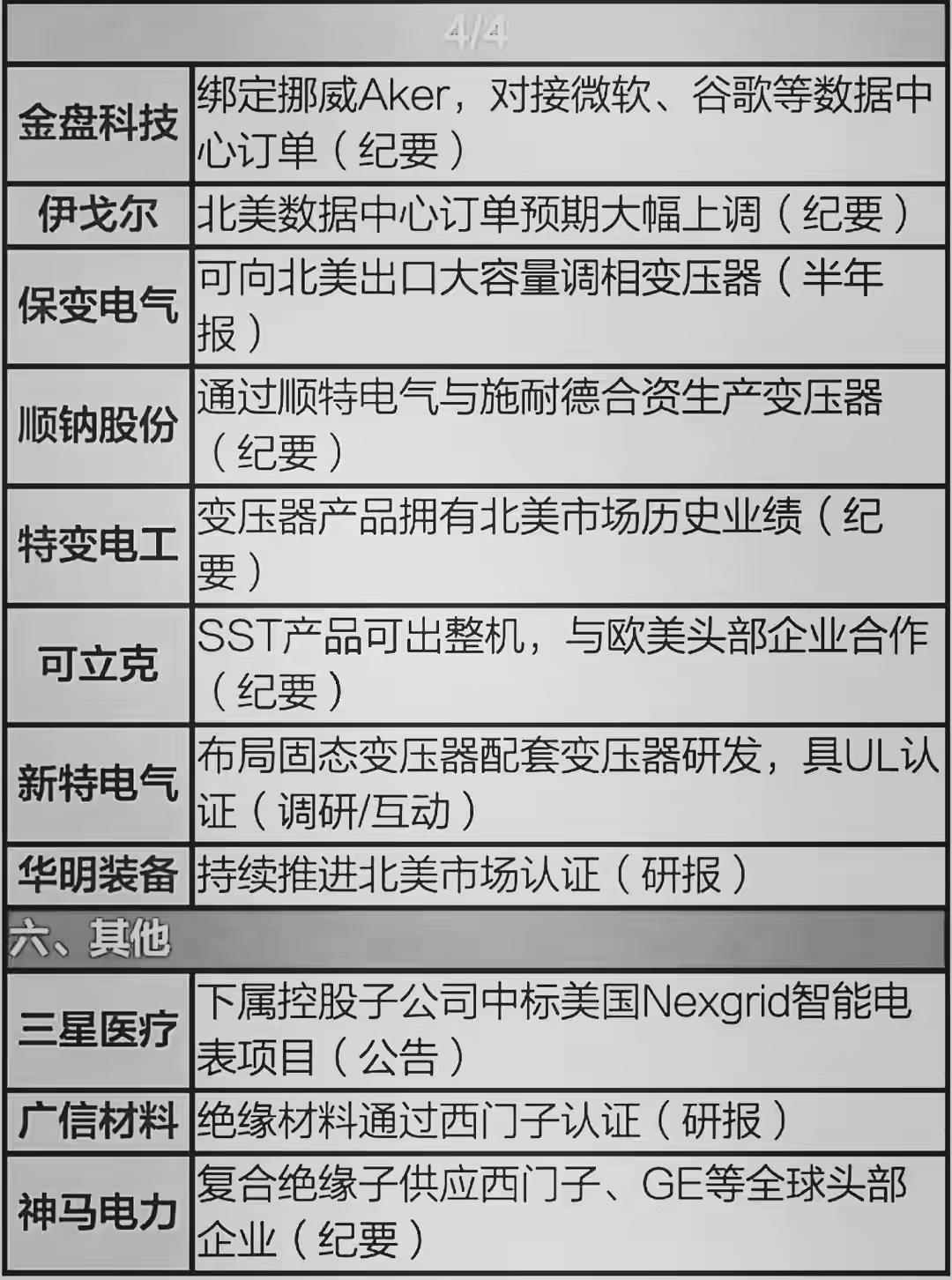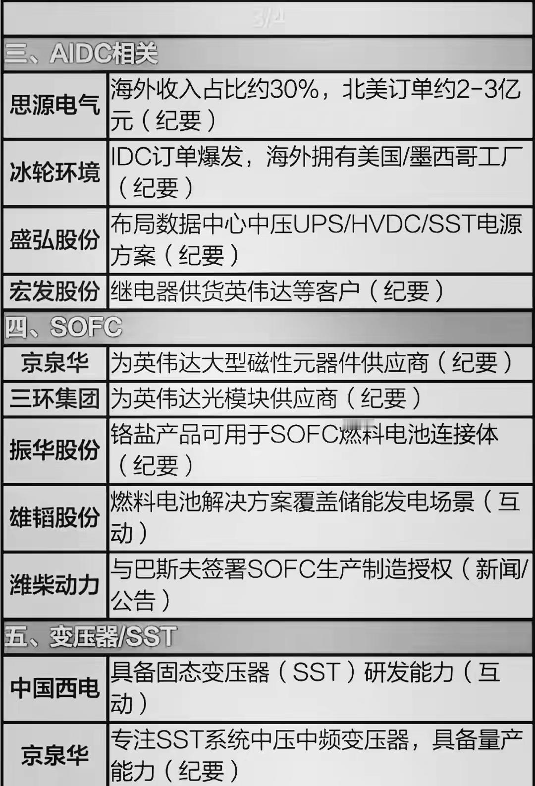 对中国A股上市公司在多个与AI电力、新能源及高端制造相关领域的业务布局与国际合作情况的系统梳理,共分为五个主要板块,分别是: 一、燃气轮机(第1张图) 聚焦国内A股上市公司在燃气轮机关键零部件制造与供应链合作方面的业务,主要合作伙伴包括国际巨头如GE(通用电气)、西门子、三菱、卡特彼勒等。 重点公司及动态: - 飞沃科技:为GE Vernova供应燃气轮机燃烧室钣金件及精密加工件。 - 航亚科技:向美国GE提供压气机叶片、压气机盘、涡轮盘等核心部件。 - 应流股份:国内燃机叶片龙头企业,与GE、西门子等深度合作。 - 万泽股份、航宇科技、博盈特焊、福鞍股份、豪迈科技、联德股份、隆达股份等:分别在高温合金、叶片、环锻件、燃烧系统、燃机制造基地、焊接组件、粉末材料等领域,为国际燃机厂商提供关键材料或部件,有的已进入北美或全球供应链体系。 👉 总结:该板块展现了中国企业在全球燃气轮机供应链中从零部件制造到材料供应的全面参与,尤其在高端精密加工和材料领域逐步实现国产替代和国际化。 二、储能(第2张图) 涵盖储能系统、光伏逆变器、储能电池及系统集成等领域,多家公司业务已进入北美等主流市场,部分企业处于行业领先地位。 重点公司及动态: - 阳光电源:北美储能业务稳居第一梯队。 - 阿特斯:储能出货占比预计提升至50%。 - 正泰电器 / 正泰电源:北美工业类光伏逆变器出货量第一。 - 海博思创、科陆电子、西典新能、东方日升、天合光能等:在北美有储能系统集成、运营项目、CCS(电芯连接系统)供应、储能工厂建设及海外订单等布局,部分直接与Tesla、Fluence等国际大厂合作。 👉 总结:中国储能企业正加速进入全球尤其是北美市场,在光伏逆变器、储能系统、电芯及连接方案等领域形成完整产业链布局,部分企业已成为细分领域隐形冠军。 三、AIDC(人工智能数据中心相关)、SOFC(固体氧化物燃料电池)、变压器/SST(固态变压器/中频变压器)(第3张图) 本部分分为三个子板块,聚焦服务于AI数据中心、新能源发电及电力调节的高端电力电子与基础设施领域。 1. AIDC相关(人工智能数据中心) - 思源电气:海外收入占约30%,北美订单2~3亿元。 - 冰轮环境:IDC(互联网数据中心)订单爆发,拥有美国/墨西哥工厂。 - 盛弘股份:布局数据中心用中压UPS、HVDC、SST电源方案。 - 宏发股份:继电器产品供货英伟达等AI算力基础设施核心客户。 2. SOFC(固体氧化物燃料电池) - 京泉华:为英伟达供应大型磁性元器件。 - 三环集团:为英伟达供应光模块。 - 振华股份:铬盐产品可用于SOFC燃料电池连接体。 - 雄韬股份、潍柴动力:在燃料电池系统及SOFC制造技术授权方面有布局。 3. 变压器/SST - 中国西电:具备固态变压器(SST)研发能力。 - 京泉华:专注SST系统中压中频变压器,已具备量产能力。 👉 总结:该板块凸显中国企业在服务AI数据中心、新能源及电力转换与控制的前沿技术领域的全球竞争力,部分企业已直接供货英伟达等AI算力基础设施巨头。 四、数据中心与电力传输设备(第4张图) 重点围绕数据中心供电与电力传输设备,特别是变压器、调相变压器、SST等相关产品在北美市场的应用与拓展。 重点公司及动态: - 金盘科技:绑定挪威Aker,间接对接微软、谷歌等国际数据中心订单。 - 伊戈尔:北美数据中心订单预期大幅上调。 - 保变电气:具备向北美出口大容量调相变压器的能力。 - 顺钠股份、特变电工、可立克、新特电气、华明装备等:涉及变压器、SST、整流及电力设备制造,部分产品已获北美市场准入或历史业绩。 其他领域: - 三星医疗:中标美国智能电表项目。 - 广信材料:绝缘材料获得西门子认证。 - 神马电力:复合绝缘子产品供应西门子、GE等全球电力设备龙头。 👉 总结:中国电力设备企业正深度参与全球数据中心与电网建设,特别是在变压器、智能电表、绝缘材料等关键产品上实现了国际认证和批量供货,部分企业已成为全球供应链中不可或缺的一环。 综合结论: 这四张图片合在一起,构成了一份较为全面的中国A股上市公司在AI电力、燃气轮机、储能、高端电力设备、数据中心供电系统等前沿和关键能源科技领域的业务布局图谱。主要体现出以下几个趋势和特点: 1. 国际化程度高:大量企业为国际巨头(如GE、西门子、三菱、英伟达、Tesla、Fluence等)提供核心零部件、材料或系统,业务覆盖北美、欧洲等重点市场。 2. 产业链完整:从燃气轮机零部件、储能系统、电力电子设备,到AI数据中心供电方案,中国企业已形成较完整的高端制造与能源科技产业链。
