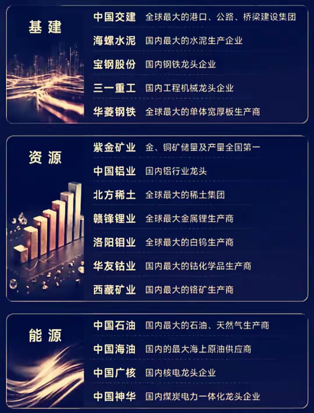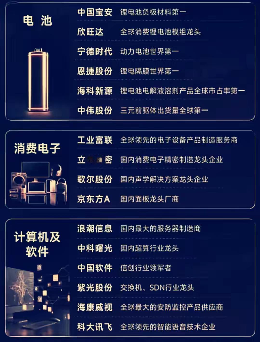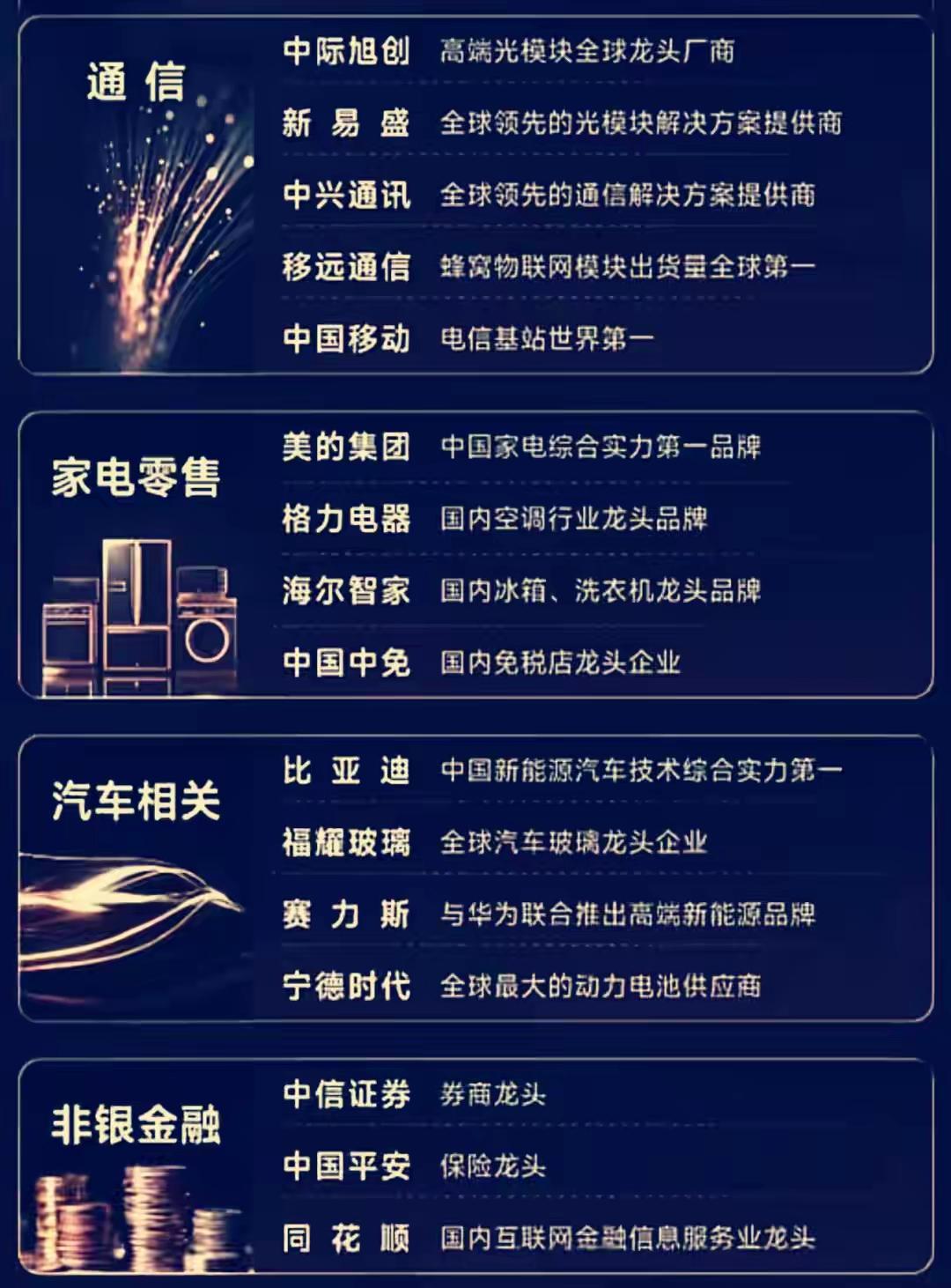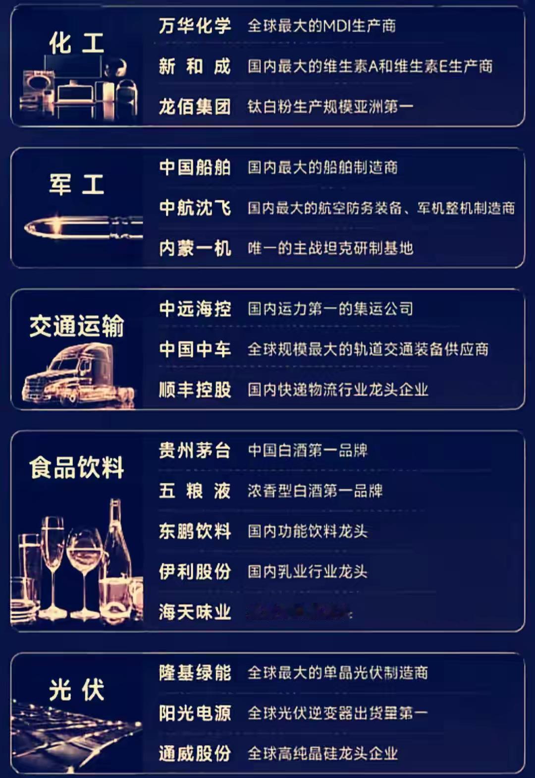以下分别介绍了中国多个核心行业的龙头企业及其领先地位,涵盖: - 半导体与机器人:如北方华创(半导体设备龙头)、中芯国际(晶圆代工全球领先)、机器人(产业链领导企业)等; - 电池、消费电子与计算机软件:如宁德时代(动力电池全球第一)、海康威视(全球最大安防供应商)、科大讯飞(智能语音全球领先)等; - 通信、家电、汽车与非银金融:如中兴通讯(通信方案全球领先)、比亚迪(新能源车技术第一)、美的集团(家电综合第一)、中信证券(券商龙头)等; - 资源与能源:如紫金矿业(金铜储量产量全国第一)、中国石油(国内油气生产最大)、中国神华(煤炭电力一体化龙头)等; - 化工、军工、交通、食品饮料与光伏:如万华化学(全球最大MDI生产商)、贵州茅台(白酒第一品牌)、隆基绿能(全球最大单晶光伏制造商)等; - 医药:如药明康德(CRO/CTDMO龙头)、迈瑞医疗(医疗器械龙头)、恒瑞医药(化学制药综合第一)等。 整体展现了中国在科技、制造、资源、金融、消费和医药等多个关键领域的核心企业与行业领导地位。