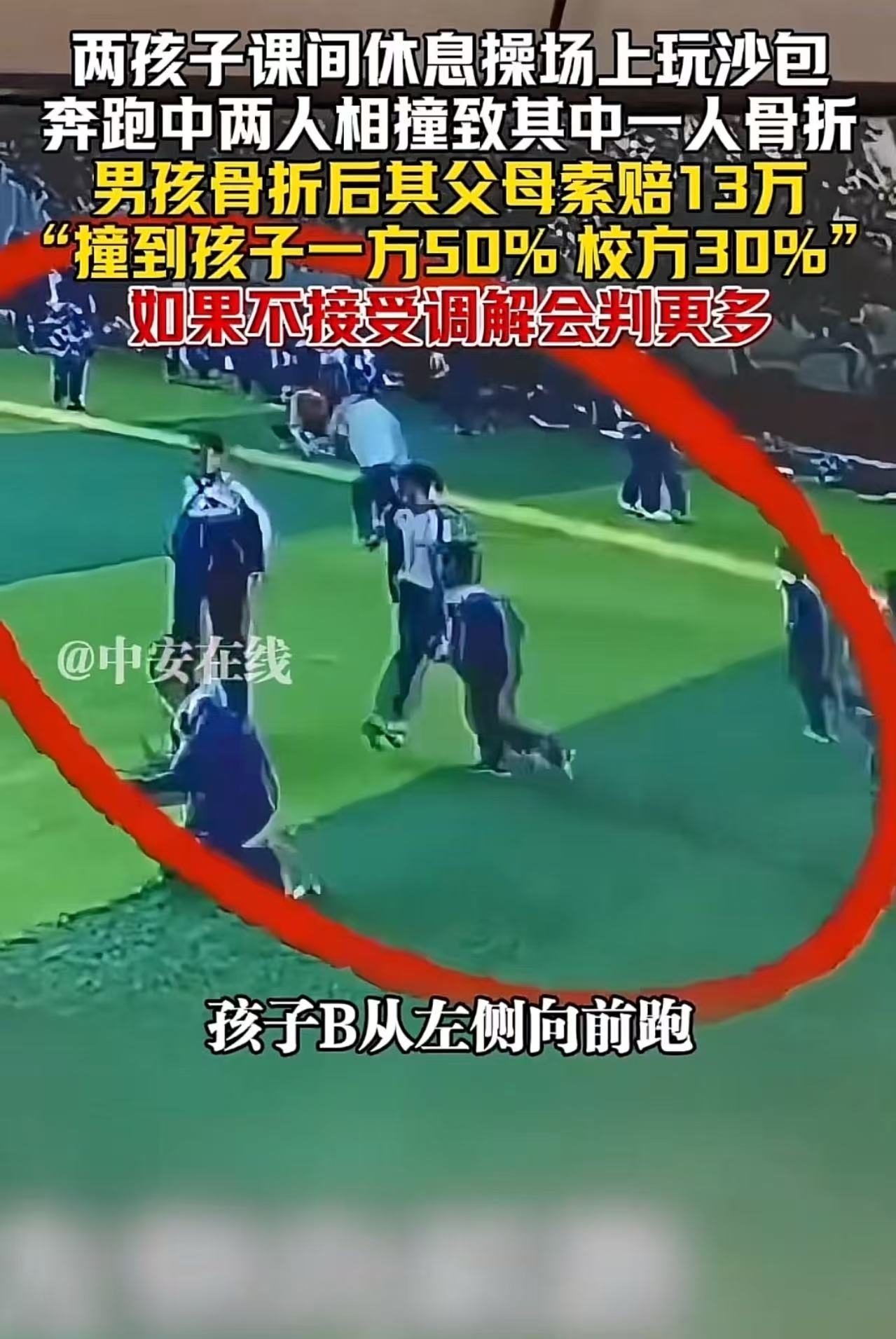 “他撞的我家孩子,凭什么让我赔钱?”吉林,两孩子课间休息,操场上玩耍,奔跑中两人相撞致其中一人骨折。骨折的男孩父母索赔13万,法官让另一方父母赔偿50%,校方赔偿30%,如果不接受调解会判更多?
