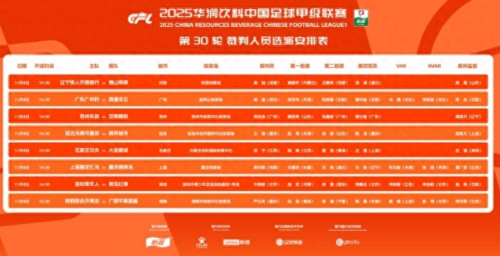 中甲第30轮裁判选派结果公布,其中广东广州豹vs南通支云、上海嘉定汇龙vs重庆铜梁龙、深圳青年人vs青岛红狮、陕西联合vs广西平果4场比赛安排有VAR裁判。