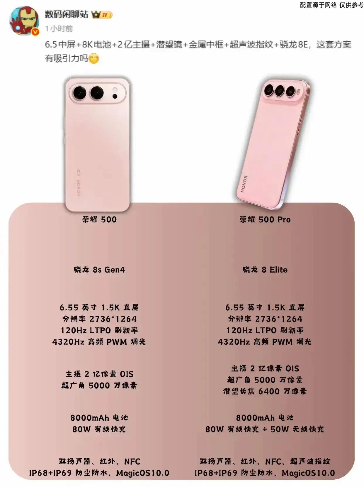 📱 荣耀500系列杀疯了!中端价格硬塞旗舰配置,这波操作太狠了! 【标准版 2499元起】 ⚡️8000mAh硅碳电池+80W快充,重度使用稳稳撑一天 ⚡️6.55英寸1.5K直屏,120Hz LTPO+4320Hz调光,流畅又护眼 ⚡️2亿主摄+OIS防抖,夜景、细节全拿下 ⚡️还上了IP68/IP69防水,同价位真的没对手! 【Pro版 3399元直接捅破天】 🔥骁龙8 Elite旗舰芯,满帧畅玩《原神》无压力 🔥升级6400万潜望长焦,支持5倍光学变焦 🔥补齐超声波指纹+50W无线充 这配置往年都是旗舰机专属,如今直接下放中端机,真的太卷了! 💥 年底想换机的朋友,这款闭眼入准没错!