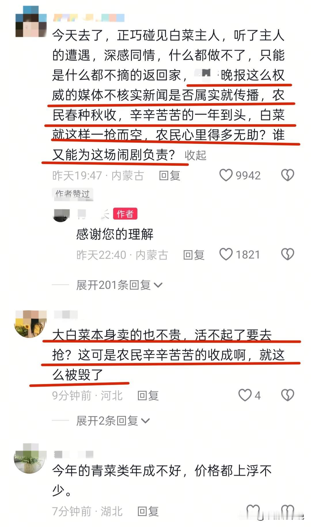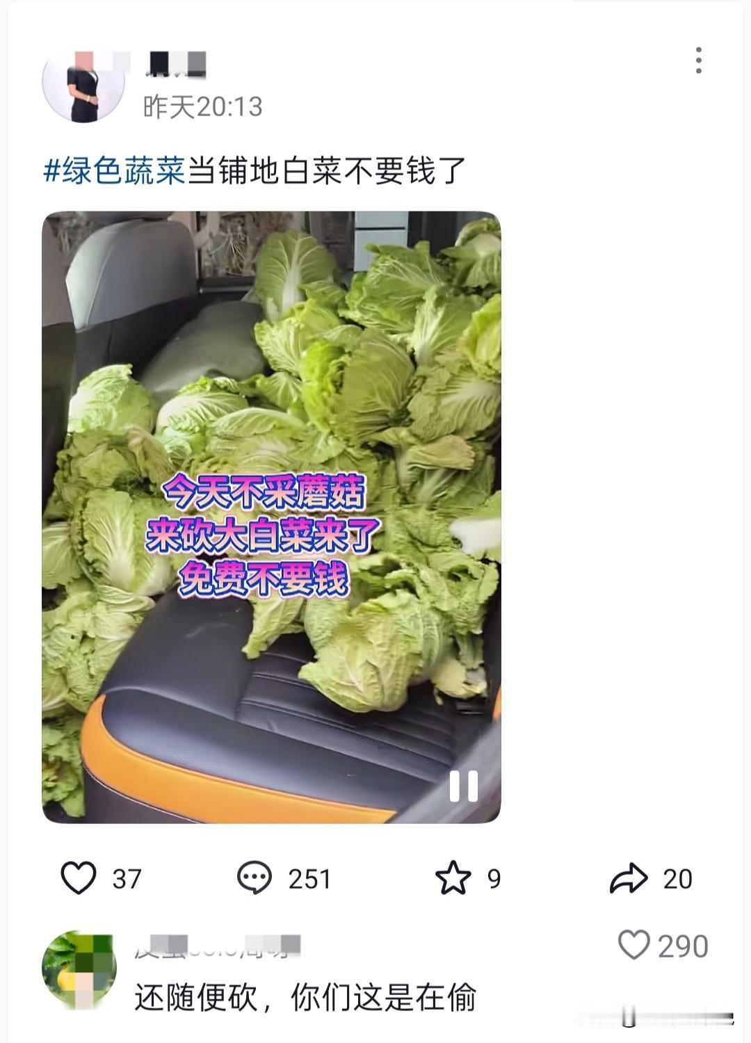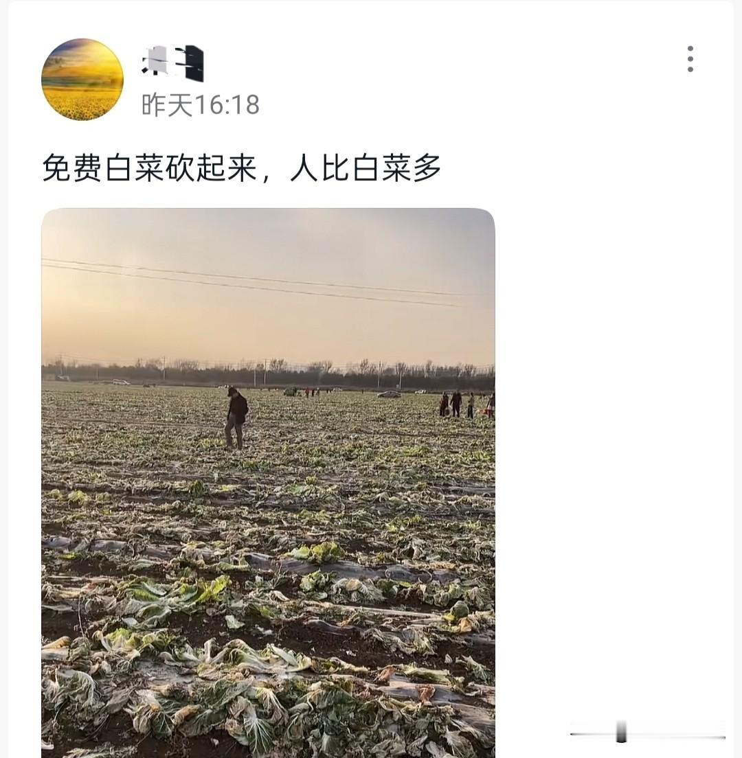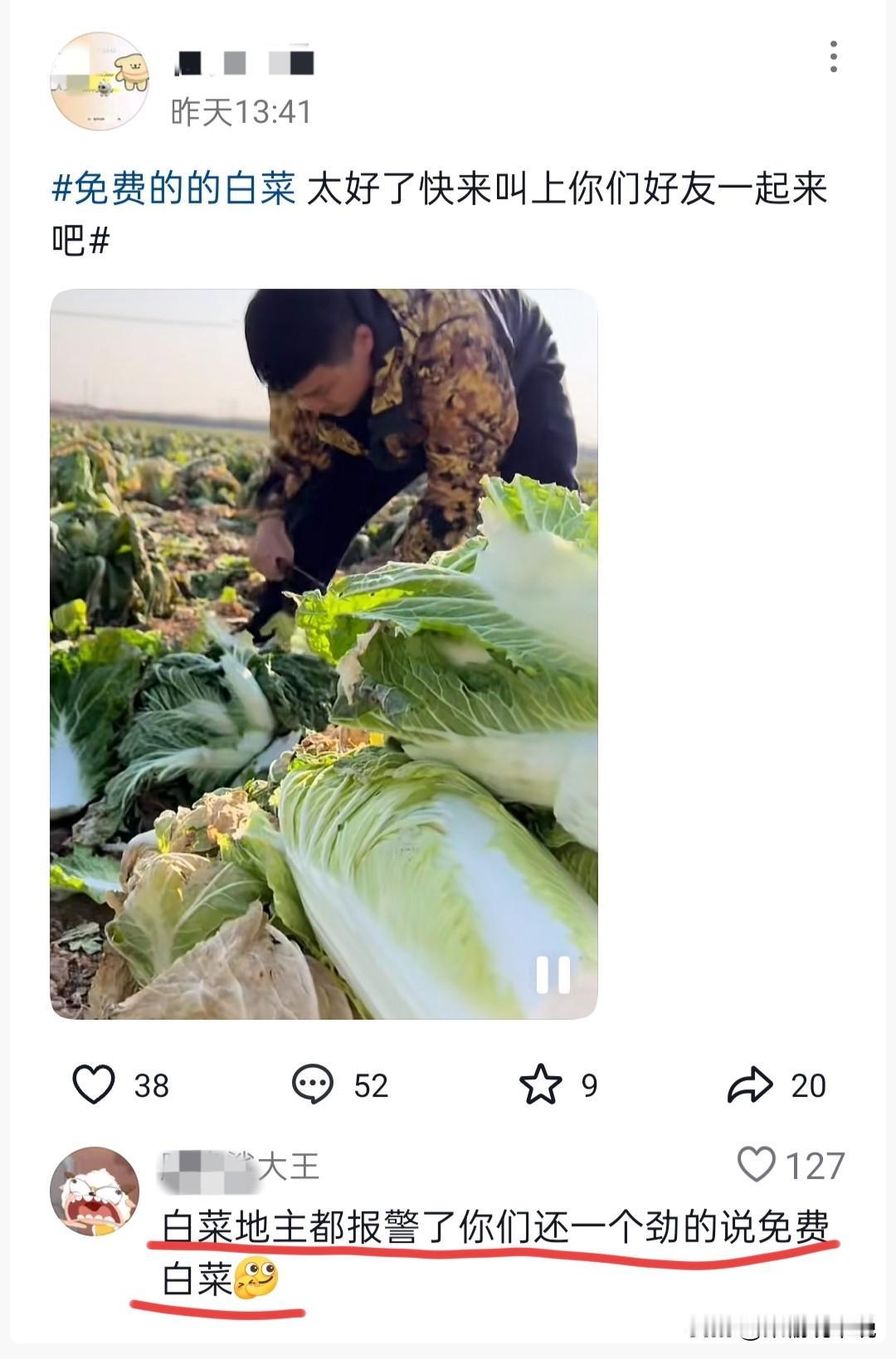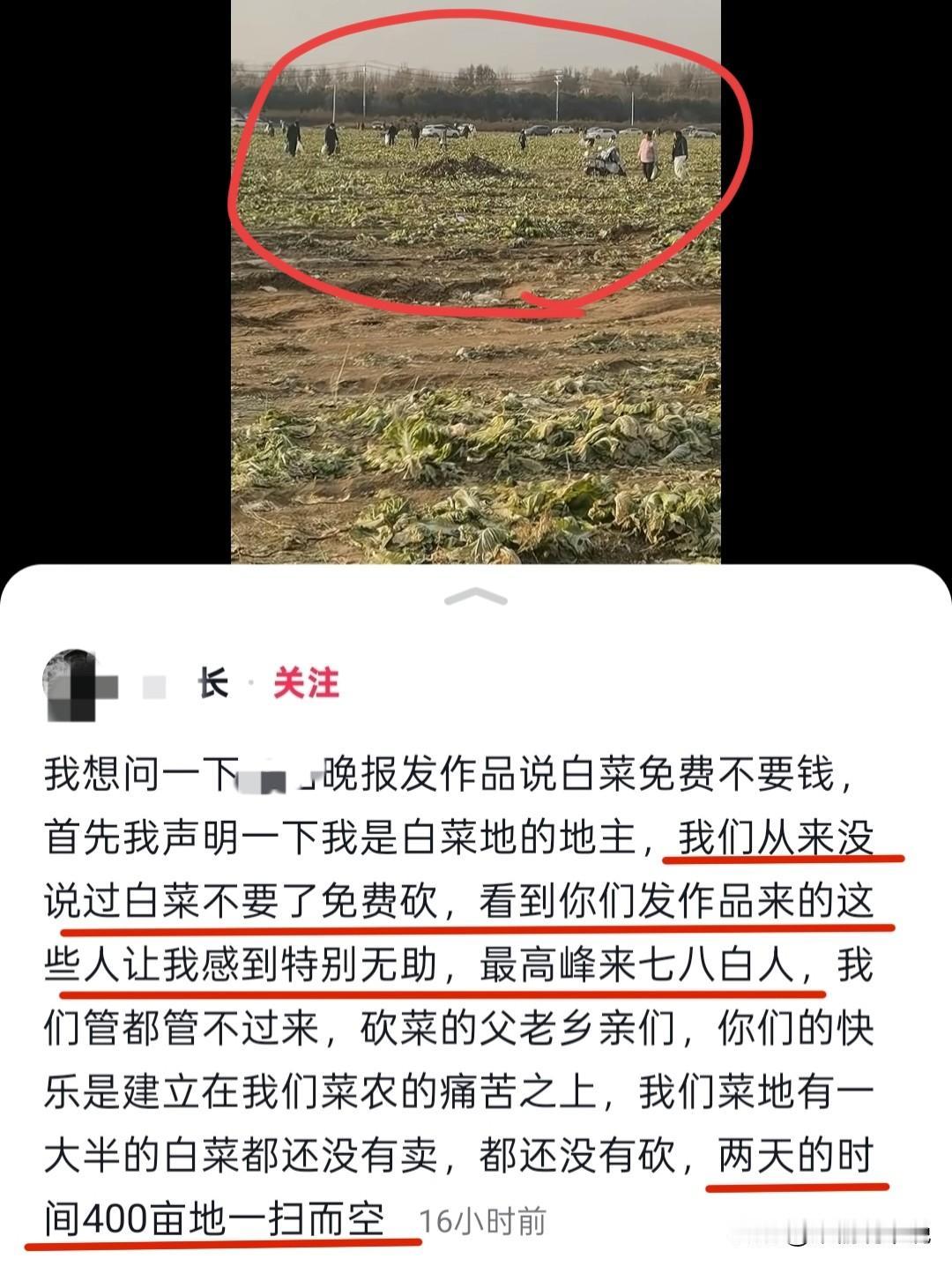 这可能是到目前为止最离谱的一个官方了,起因是某官方媒体发布了一条捡土豆、白菜的路线,结果大量民众涌入某菜农的地里,两天时间就把四百亩白菜一扫而空,菜农根本阻止不了,只能眼睁睁看着一年的幸福付之东流! 甚至不少人在自己的社交平台上晒出自己的“战利品”!看到这一幕,菜农的心酸真的要溢出屏幕了! 要说农民种点地,都是早出晚归用一滴滴汗水辛苦浇灌出来的,怎么可能不要了,发生了这样的事情,谁该为这场闹剧负责?